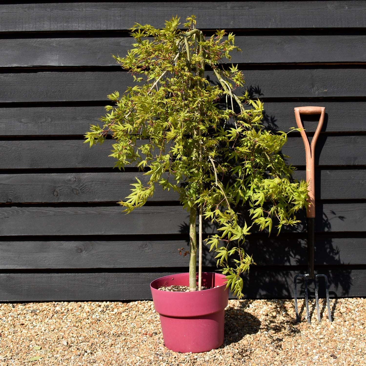Unveil the dramatic, flowing beauty of the 'Ryusen' Japanese Maple, a unique weeping variety perfect for adding a striking focal point to any garden. Unlike other weepers with dissected foliage, 'Ryusen' features vigorous, star-shaped, palmate leaves that create an unusual cascading waterfall effect. In spring, the foliage emerges in a vibrant lime-green, maturing to a rich green during the summer. The season culminates in a spectacular autumn display of fiery orange and brilliant red, ensuring year-round visual interest. This resilient, heat-tolerant tree can be trained to cascade over walls or featured beautifully in a container.
