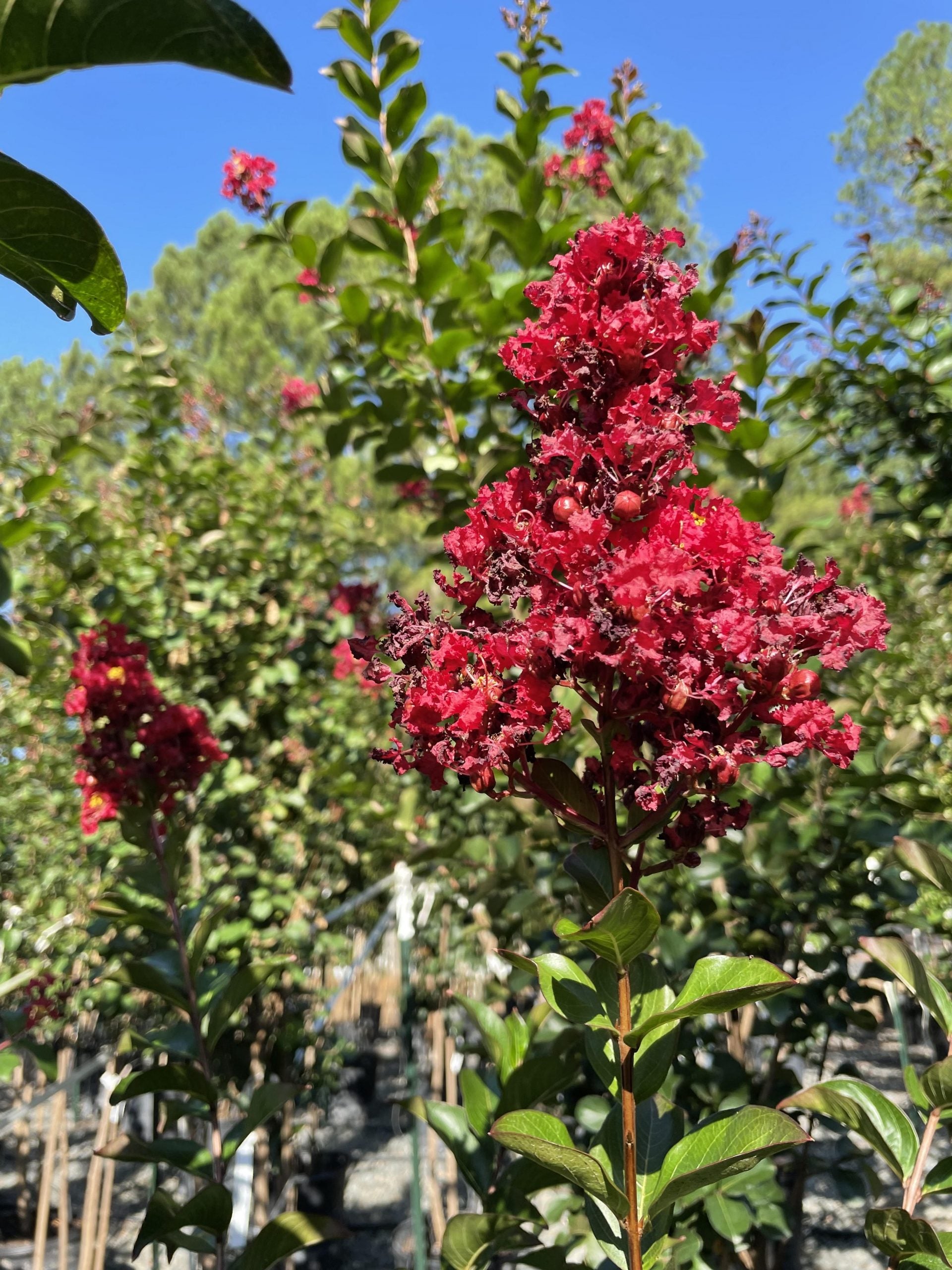 This Crape Myrtle has a vigorous, self-branching habit where it reaches 15-20 H and 8-12 W. During Summer through Fall, colorful masses of scarlet red blooms come through the deep green foliage. Full sun.