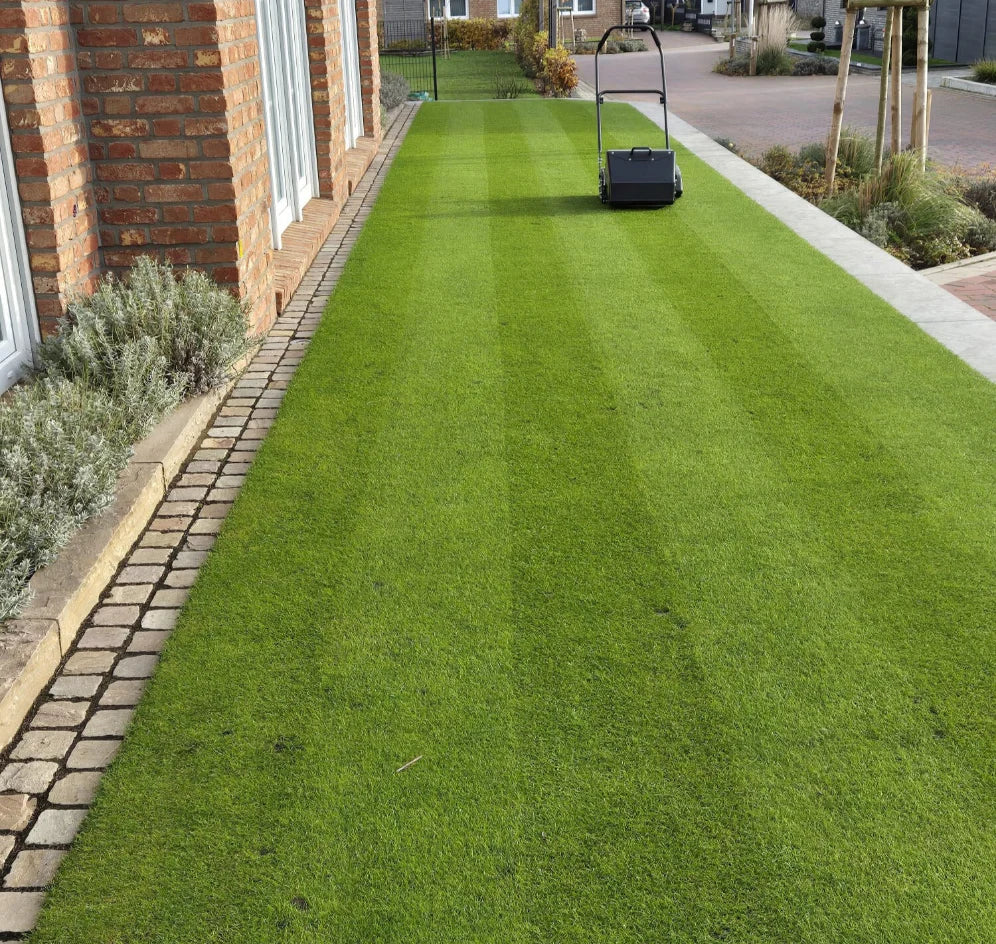 The Falkenstein Light features a cutting width of 15.75 inches (40 cm) and a weight-optimized, powder-coated steel housing in anthracite (RAL7016). The manual reel mower weighs 66 lbs (30 kg) and delivers an impressive 22 cuts per foot (73 cuts per meter) with its 7-blade reel, nearly double the cutting frequency of standard manual reel mowers, which typically achieve around 38 cuts per meter. The reel is handcrafted and then powder-coated for maximum durability. Combined with the wear-resistant carbon steel bed knife, it ensures a clean and precise cut without ribbing. The mower is suitable for a cutting height of 0.55–1.38 inches (14–35 mm).