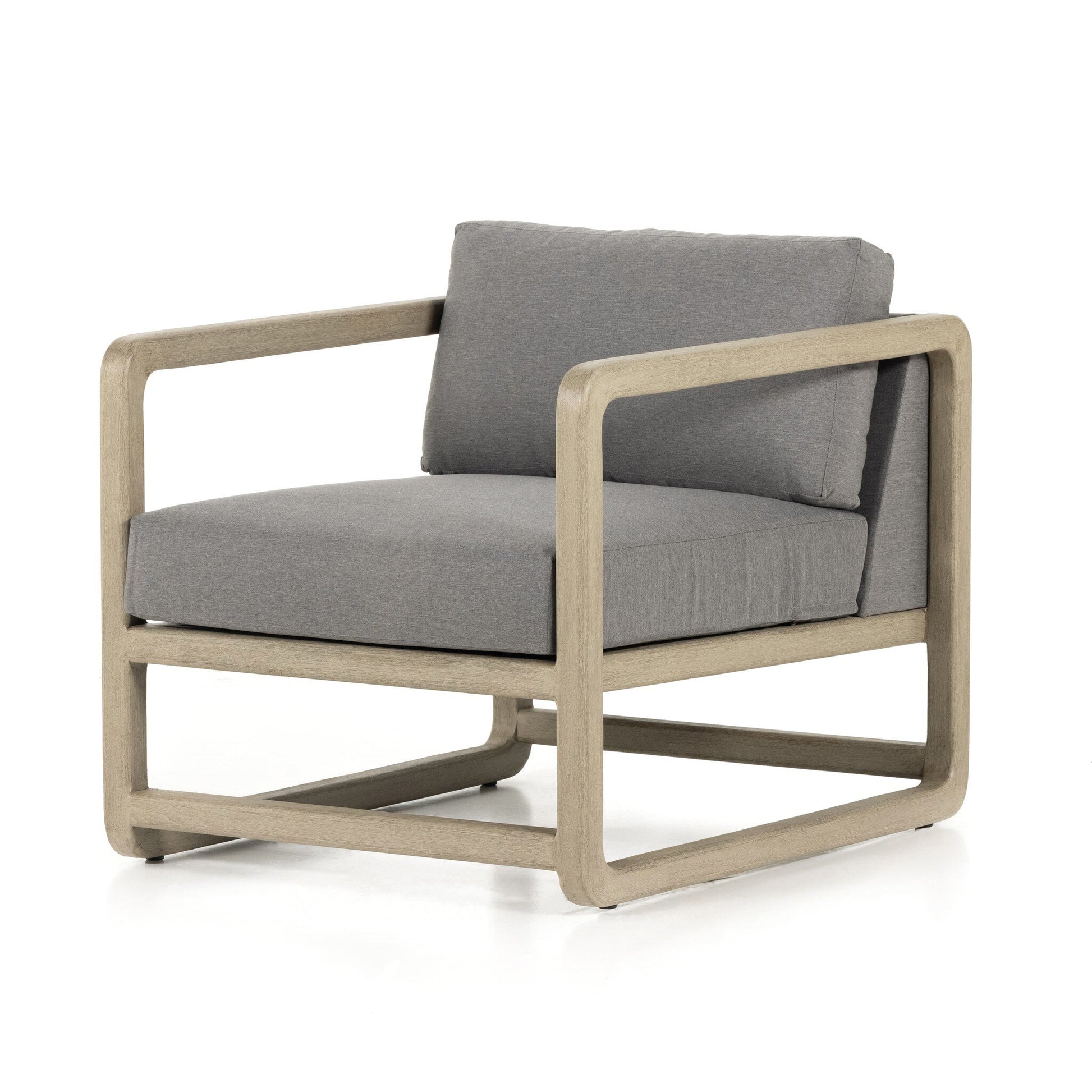 Weathered grey FSC-certified teak forms rounded corners for a novel take on open, angular framing. Upholstered in an inviting charcoal, this outdoor-friendly seating style layers in with total ease. Cover or store indoors during inclement weather. Dimensions -28.5in Width x 35.5in Depth x 48.06in Height. Weight: 48.06lbs