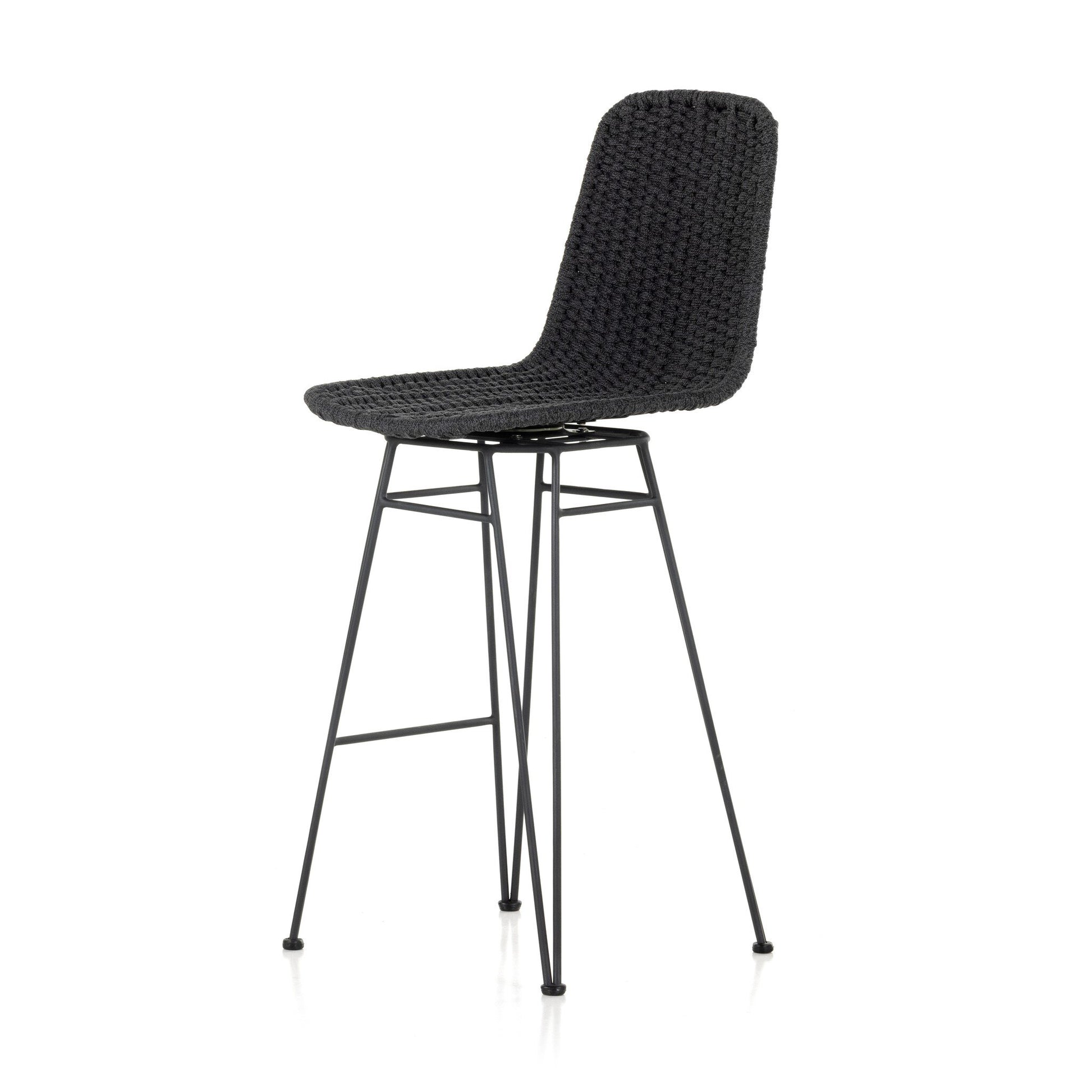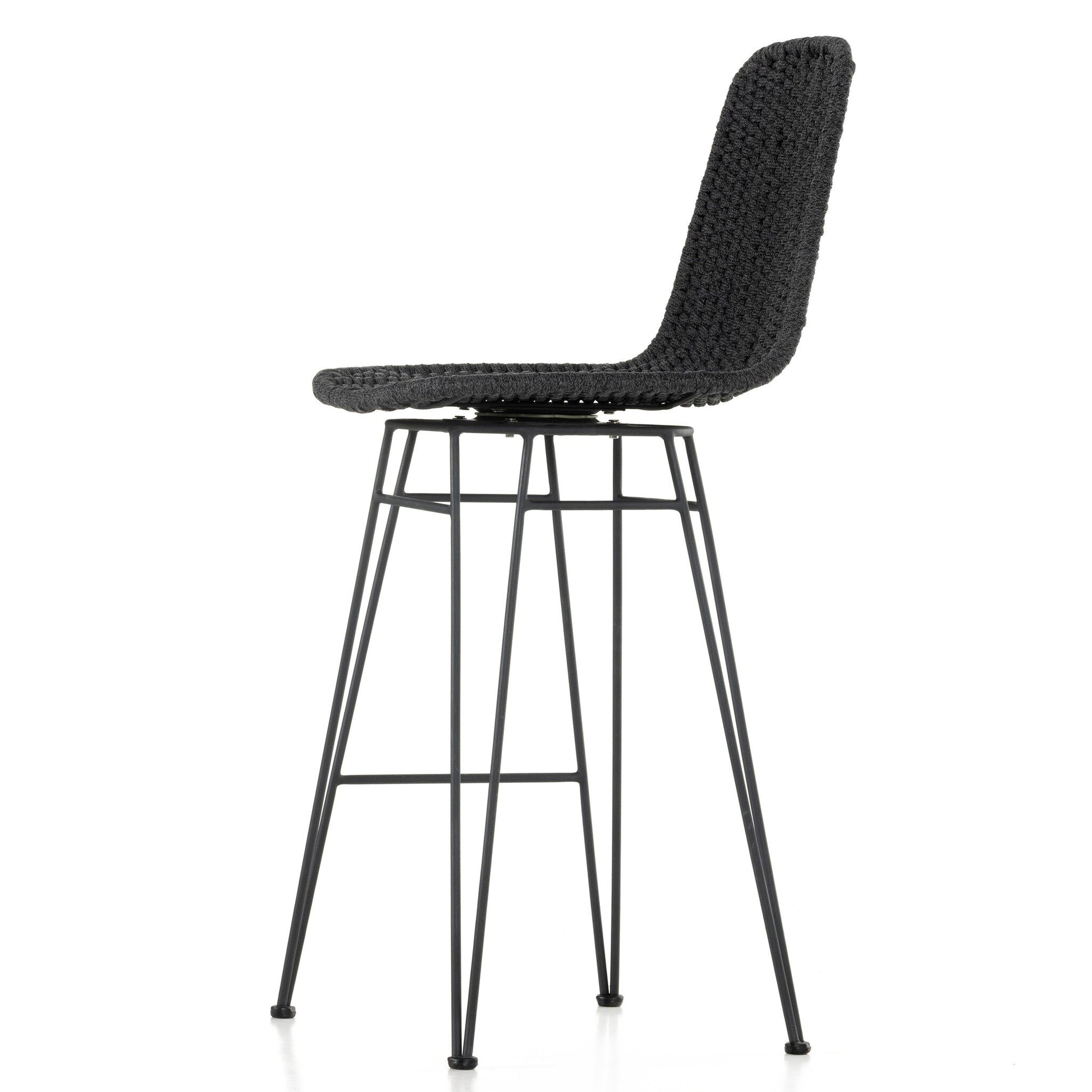 Armless rope seating weaves for fresh texture, with charcoal hairpin legs and a swivel for a fashion-forward touch. Cover or store indoors during inclement weather and when not in use. Dimensions -18in Width x 23.75in Depth x 32.08in Height. Weight: 32.08lbs