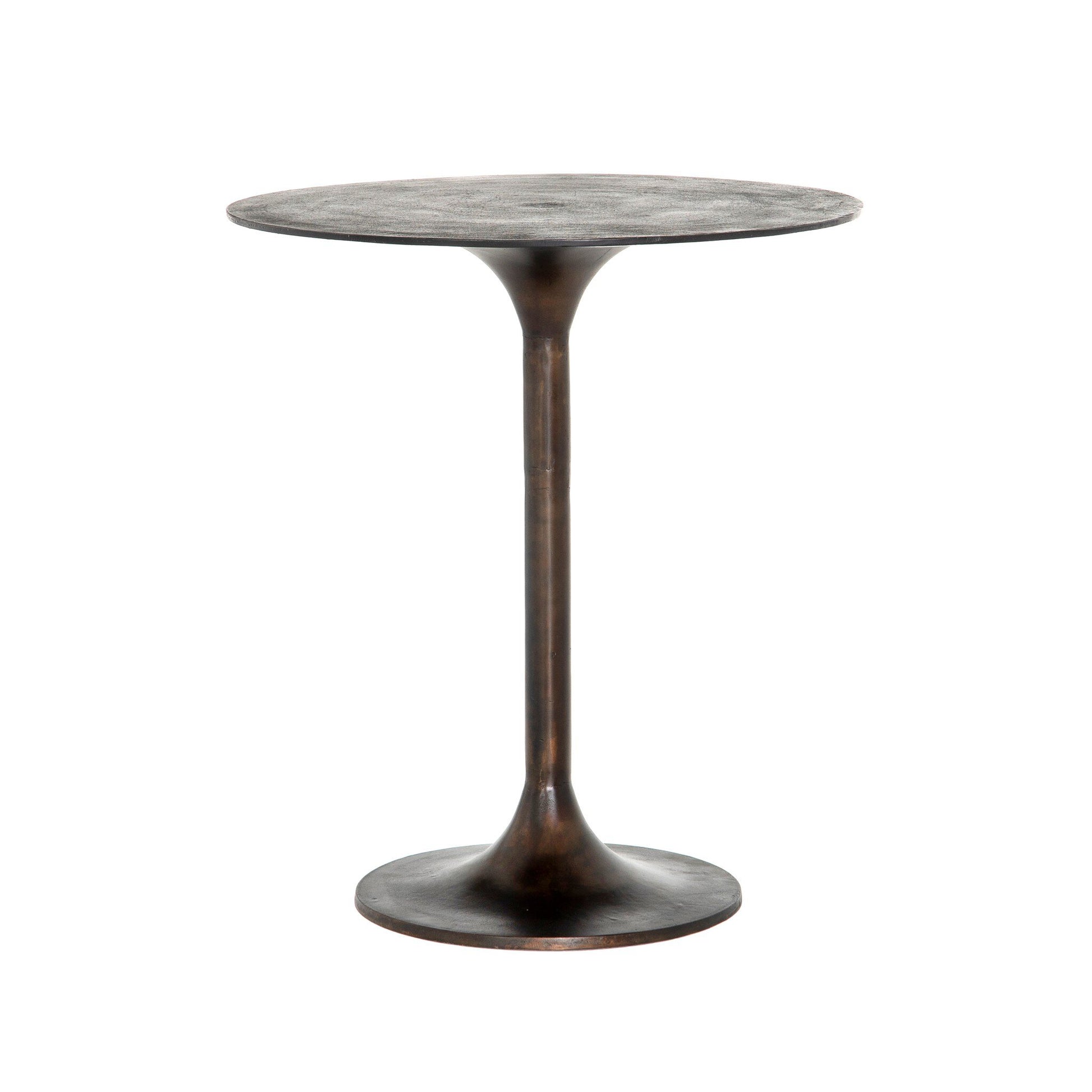 Classic tulip shaping in textural cast-aluminum makes for a modern pub table. Finished in antique rust to bring out alluring highs and lows. Great indoors or out — cover or store indoors during inclement weather and when not in use. Dimensions -32in Width x 32in Depth x 53.75in Height. Weight: 53.75lbs