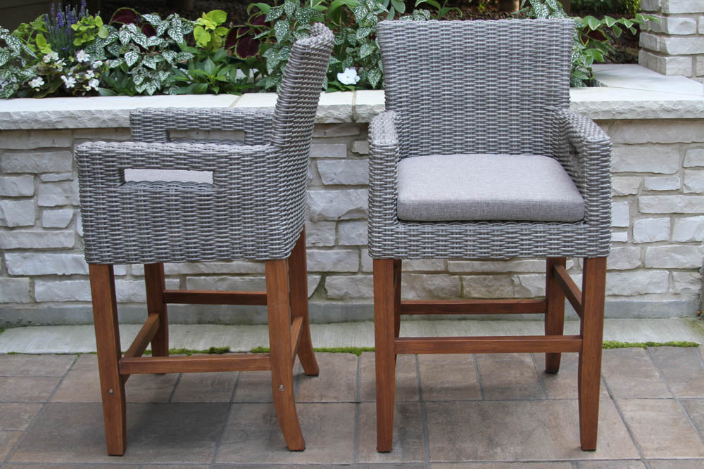 The Outdoor Interiors Light Grey Wicker & Eucalyptus Balcony Height Armchair with Olefin Cushion, 2pk. can be seated around the matching counter height tables and paired with the matching all eucalyptus counter height saddle stools.