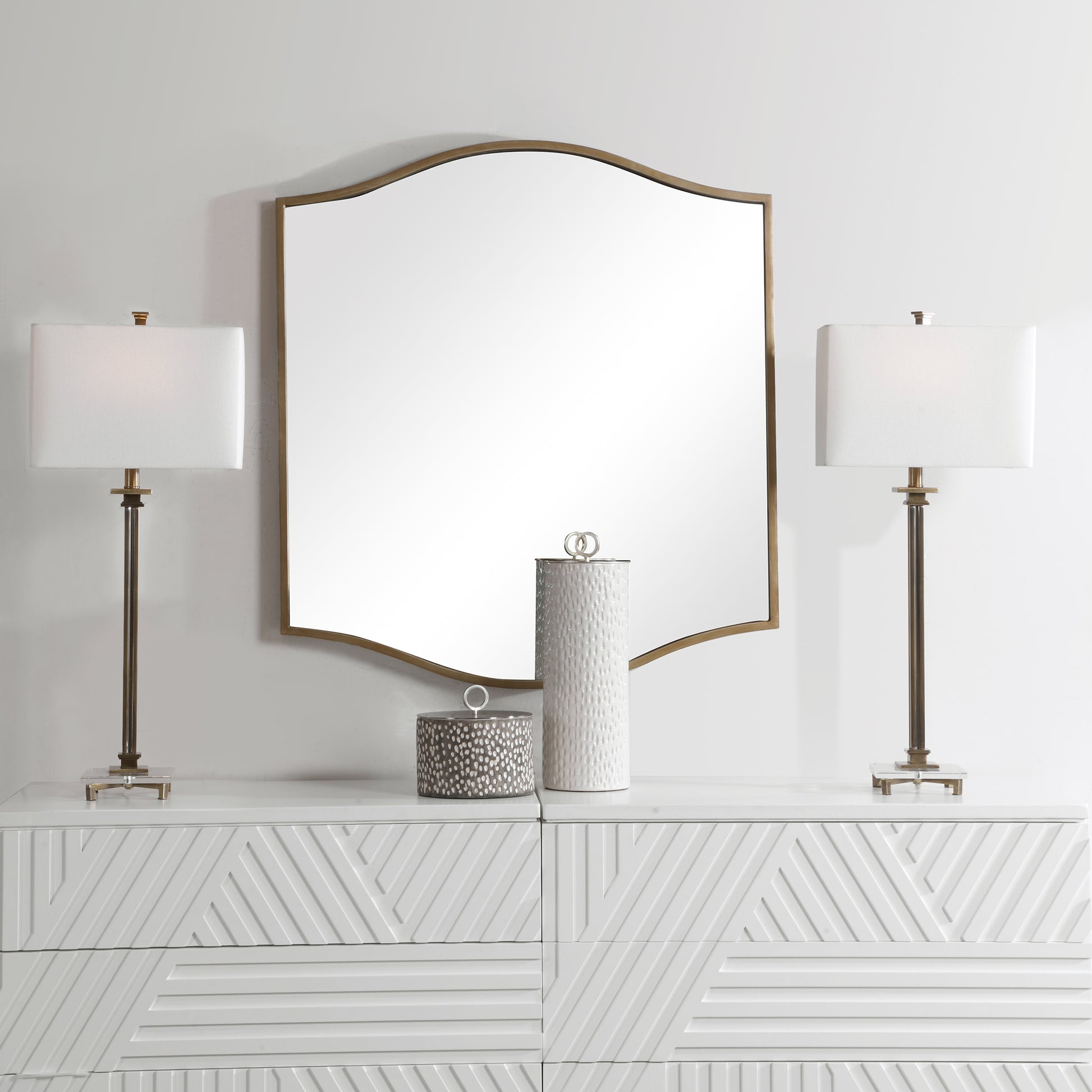 Refined and sophisticated, this antique gold mirror will add an updated traditional look to any space. Mirror has a generous 1 1/4" bevel and may be hung horizontal or vertical. Dimensions - 1.5in Depth x 36in Width x 40.75in Height. Weight - 33lbs