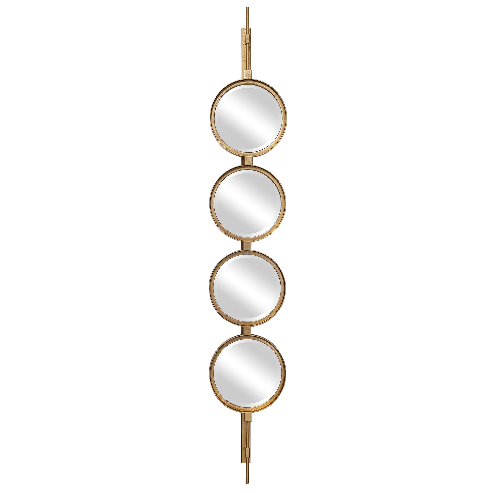 Contemporary in style, this mirror features a sleek iron base with linear metal accents. The piece is finished in gold leaf with four round beveled mirrors. Group multiple pieces together and hang horizontal or vertical to create a truly unique wall feature. Dimensions - 3.125in Depth x 9.875in Width x 59.875in Height. Weight - 11lbs