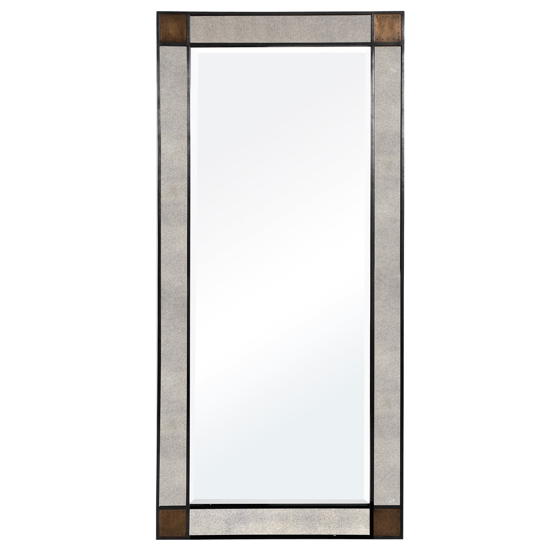 Showcasing clean lines and an industrial feel, this large-scale mirror features a dark bronze finished frame with antique mirror side panels. Each corner is accented by copper cladding with small nail head details. May be hung horizontal or vertical. Dimensions - 1.85in Depth x 34in Width x 72in Height. Weight - 57.7lbs