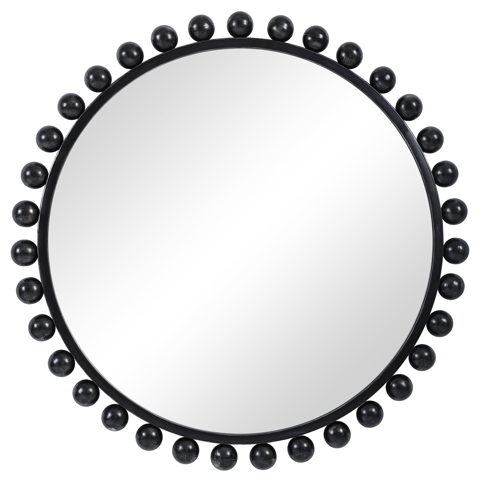 This eye-catching round mirror adds an upscale look and sophisticated style to any room by showcasing smooth iron spheres that embellish a sleek inner frame, finished in a distressed black with subtle silver undertones. Dimensions - 2.625in Depth x 44in Width x 44in Height. Weight - 31lbs