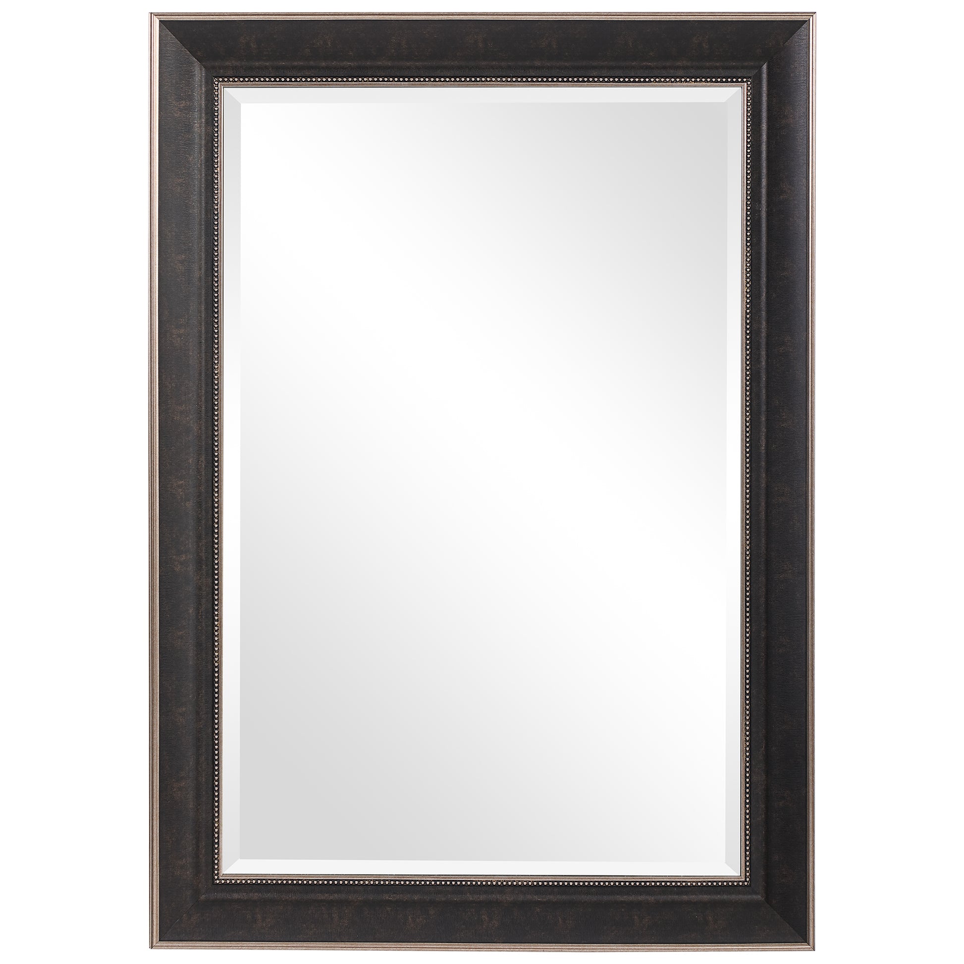 Inspired by traditional style, this rectangle mirror features a two-toned finish in a textured dark bronze paired with antiqued silver, accented with a beaded inner liner. The beveled mirror may be hung horizontal or vertical. Dimensions - 2in Depth x 30.125in Width x 42.125in Height. Weight - 19lbs