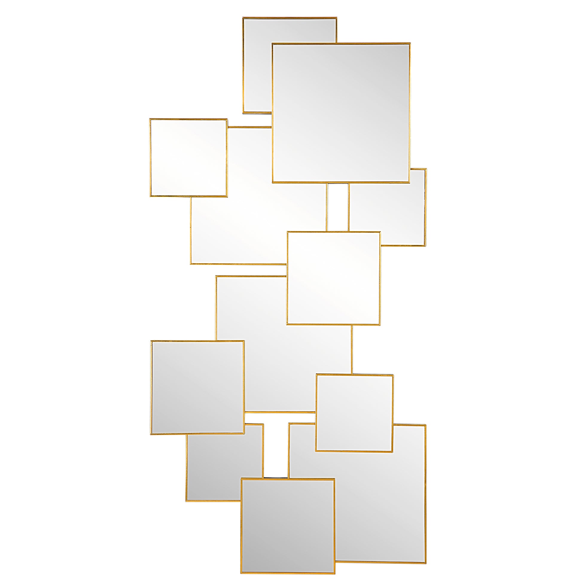 This mirror features overlapping squares encased in brass plated channeling that create a modern yet elegant feel. May be hung horizontal or vertical. Dimensions - 1in Depth x 60in Width x 30in Height. Weight - 27.63lbs