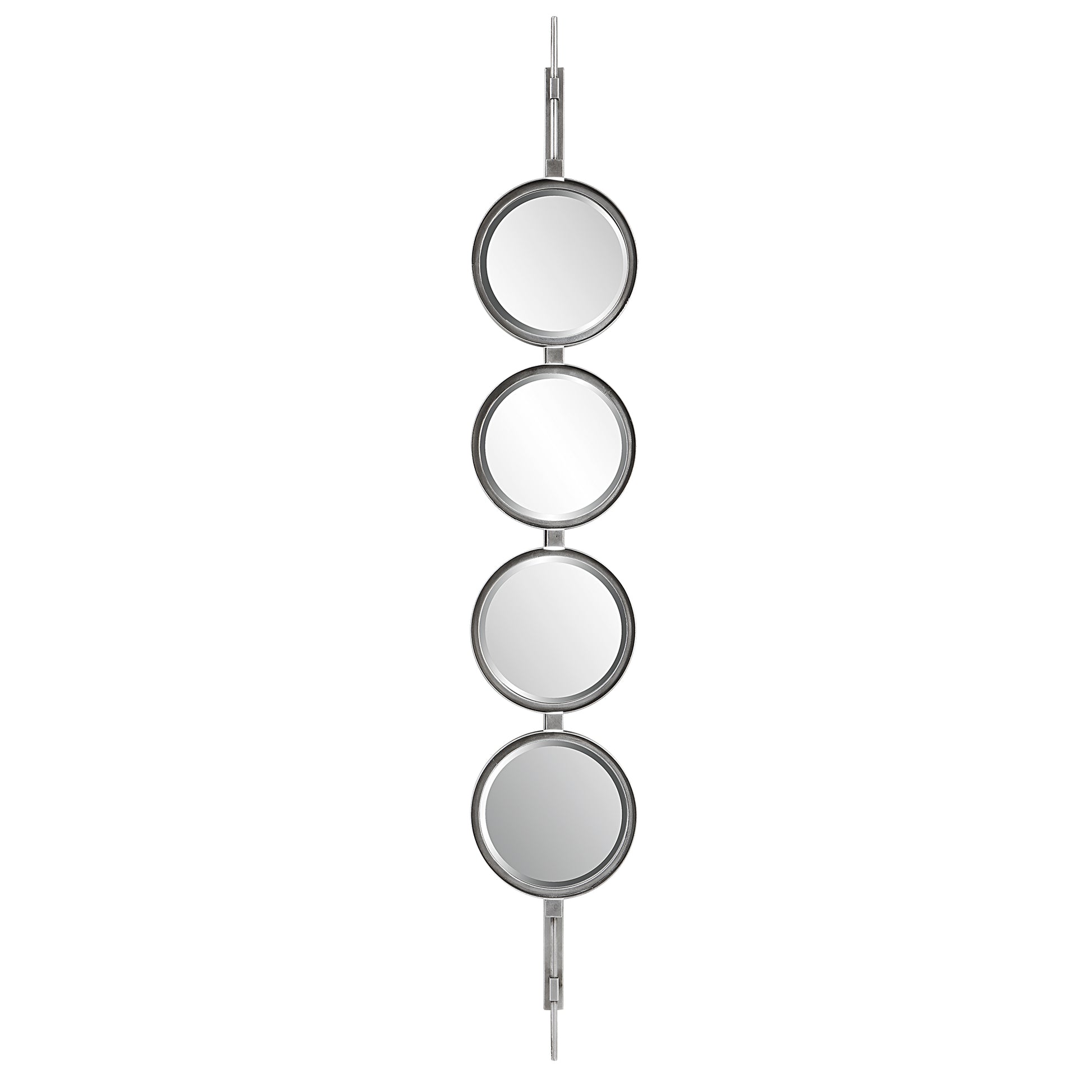 Contemporary in style, this mirror features a sleek iron base with linear metal accents. The piece is finished in silver leaf with four round beveled mirrors. Group multiple pieces together and hang horizontal or vertical to create a truly unique wall feature. Dimensions - 3.125in Depth x 9.875in Width x 59.875in Height. Weight - 11lbs