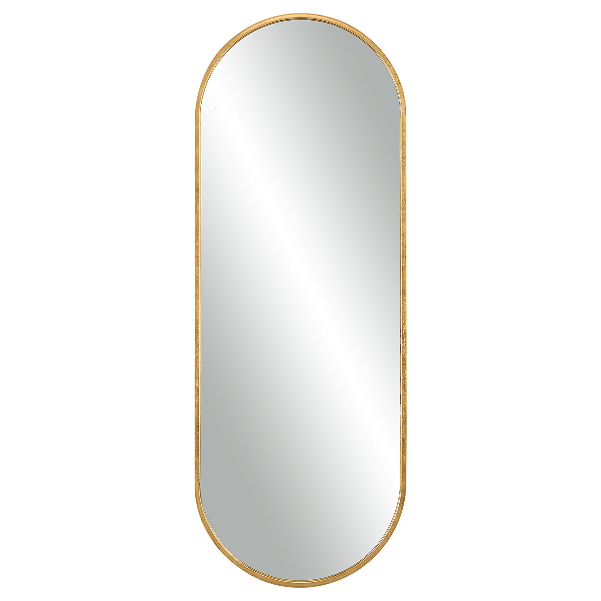 This iron oval features a lightly antiqued gold leaf finish and linear details. May be hung horizontal or vertical. Dimensions - 1.5in Depth x 22in Width x 60in Height. Weight - 27lbs