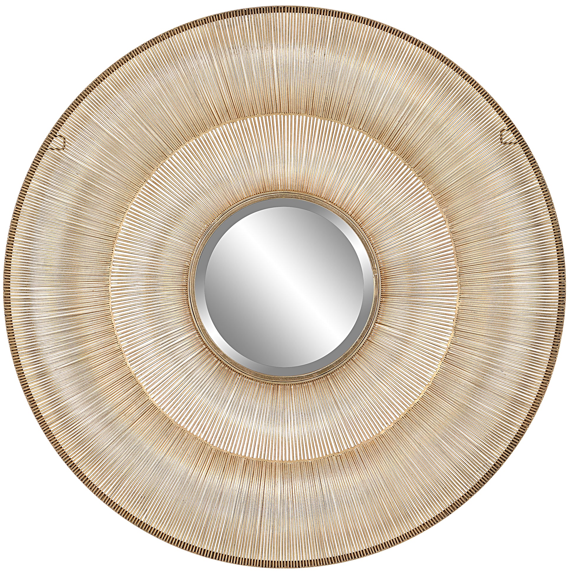 This round mirror makes a striking addition to any space. The piece showcases a substantial curved iron frame finished in an elegant brushed antique gold with a beveled center mirror. Dimensions - 3.875in Depth x 42.125in Width x 42.125in Height. Weight - 27lbs