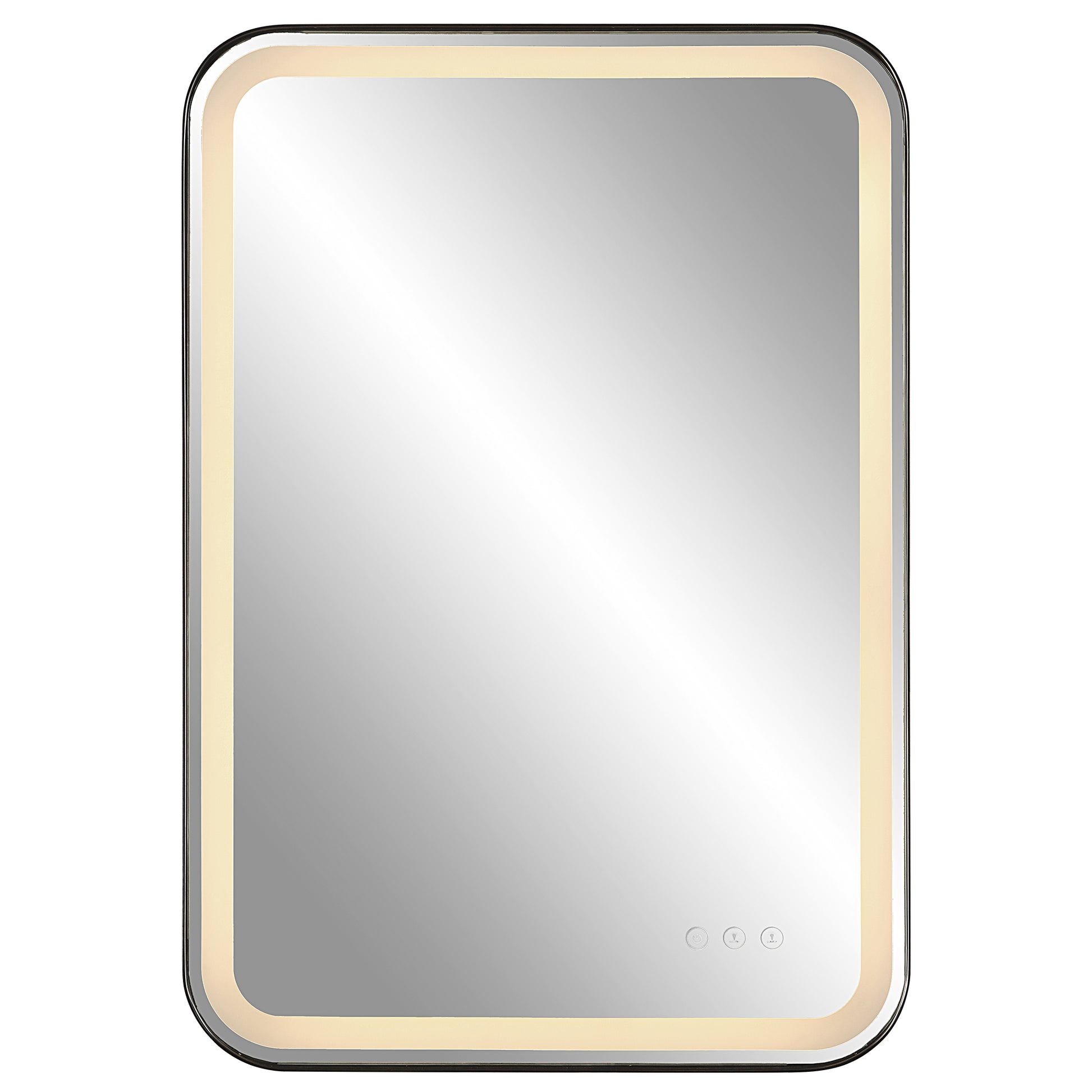 Versatile in design, this vanity mirror has integrated led lighting that illuminates through the frosted strip in the polished edged mirror. The satin black metal frame is off set from the wall to allow ambient lighting from the back. Easy to use touch buttons are featured on the bottom right of the mirror with an on off function, touch and hold kelvin control from 2700k to 4000k, and touch and hold brightness control. Led lights rated at 40,000 hours. Ships with plug, but can be hardwired professionally.Touch Screen icons continue to illuminate when powered off for easy navigation in dark settings. Dimensions - 2.125in Depth x 22.25in Width x 32.25in Height. Weight - 27lbs