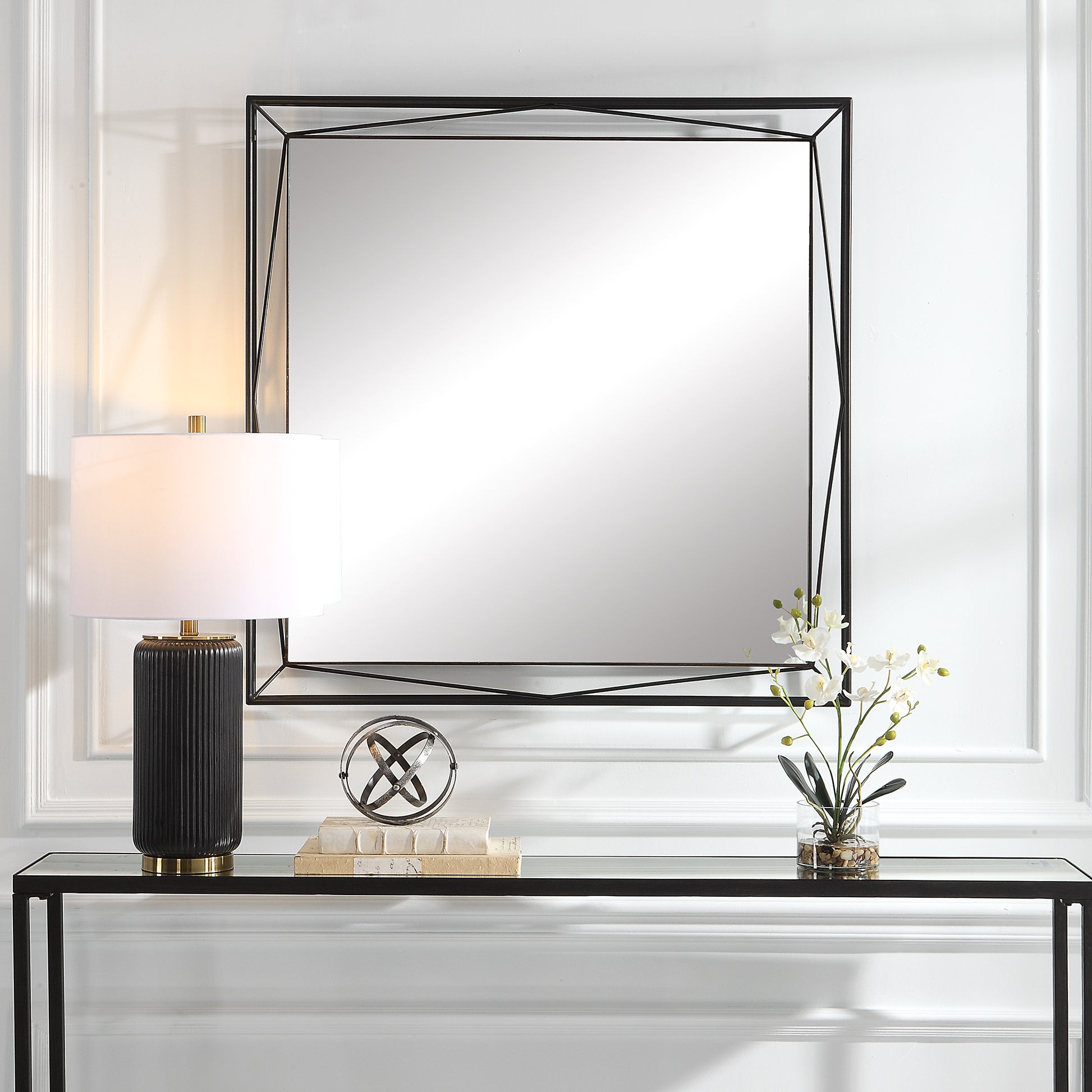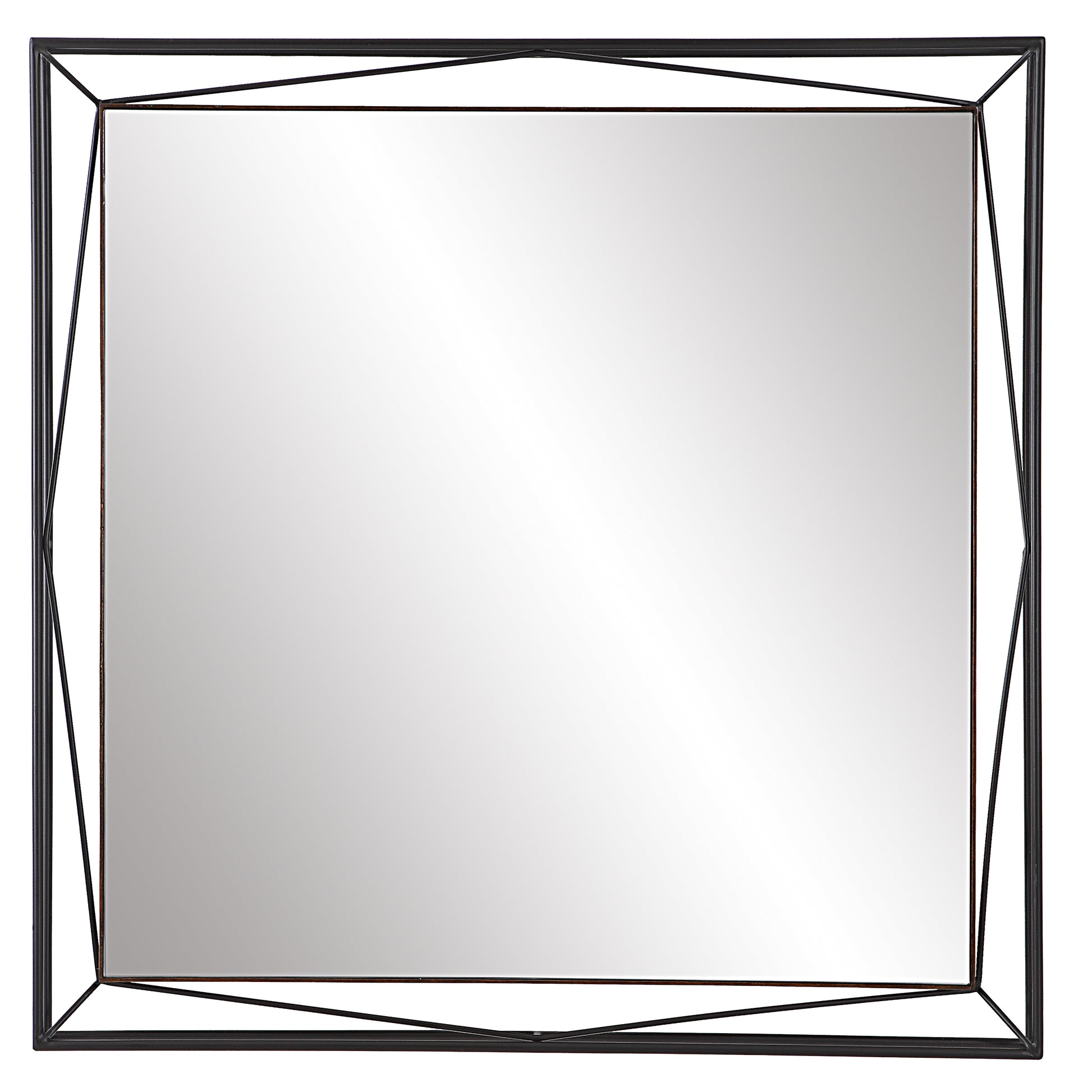 Inspired by contemporary designs, this suspended square mirror is accented by a 3-dimensional angular metal frame in satin black with a petite pond cypress wood frame surrounding the mirror. Dimensions - 2.375in Depth x 36in Width x 36in Height. Weight - 29lbs