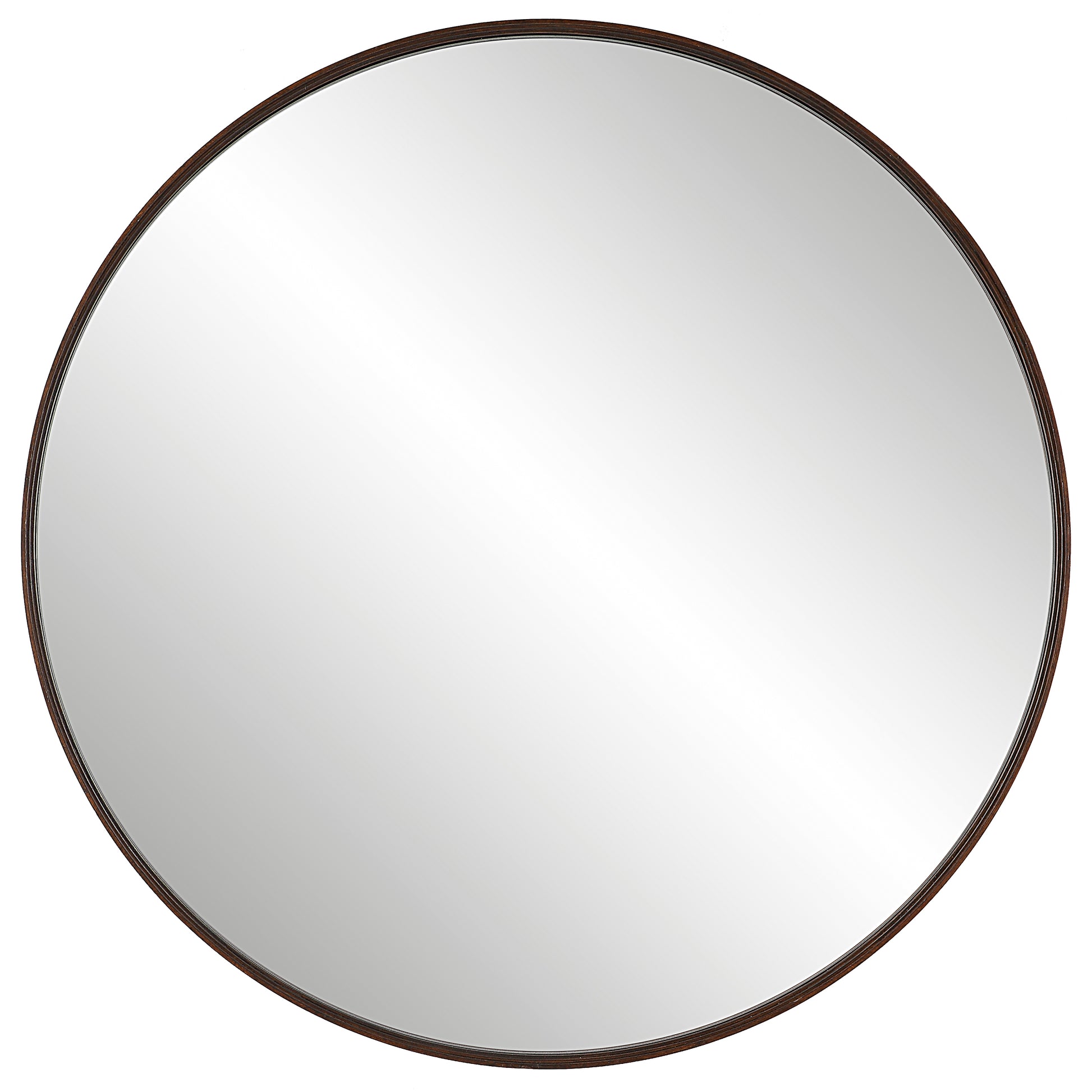 Versatile and beautiful, this round mirror displays an earthy feel with a clean stepped profile made of pond cypress wood finished in a dark mahogany stain. Dimensions - 2in Depth x 36in Width x 36in Height. Weight - 27lbs