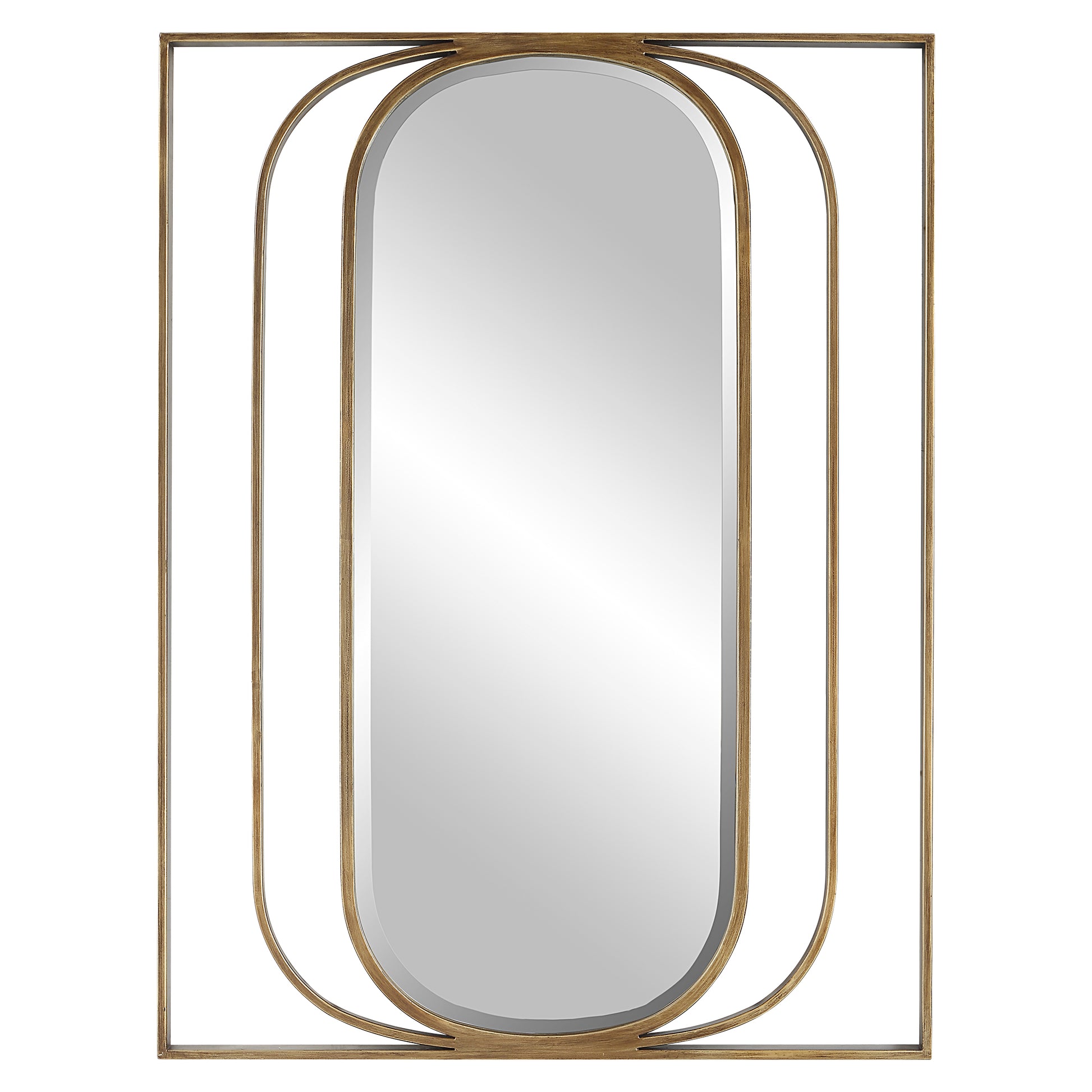 Contemporary style mirror displays a beveled oval interior with an angular metal framework finished in a heavily antiqued gold. May be hung horizontal or vertical. Dimensions - 1.25in Depth x 30in Width x 40in Height. Weight - 20.2lbs