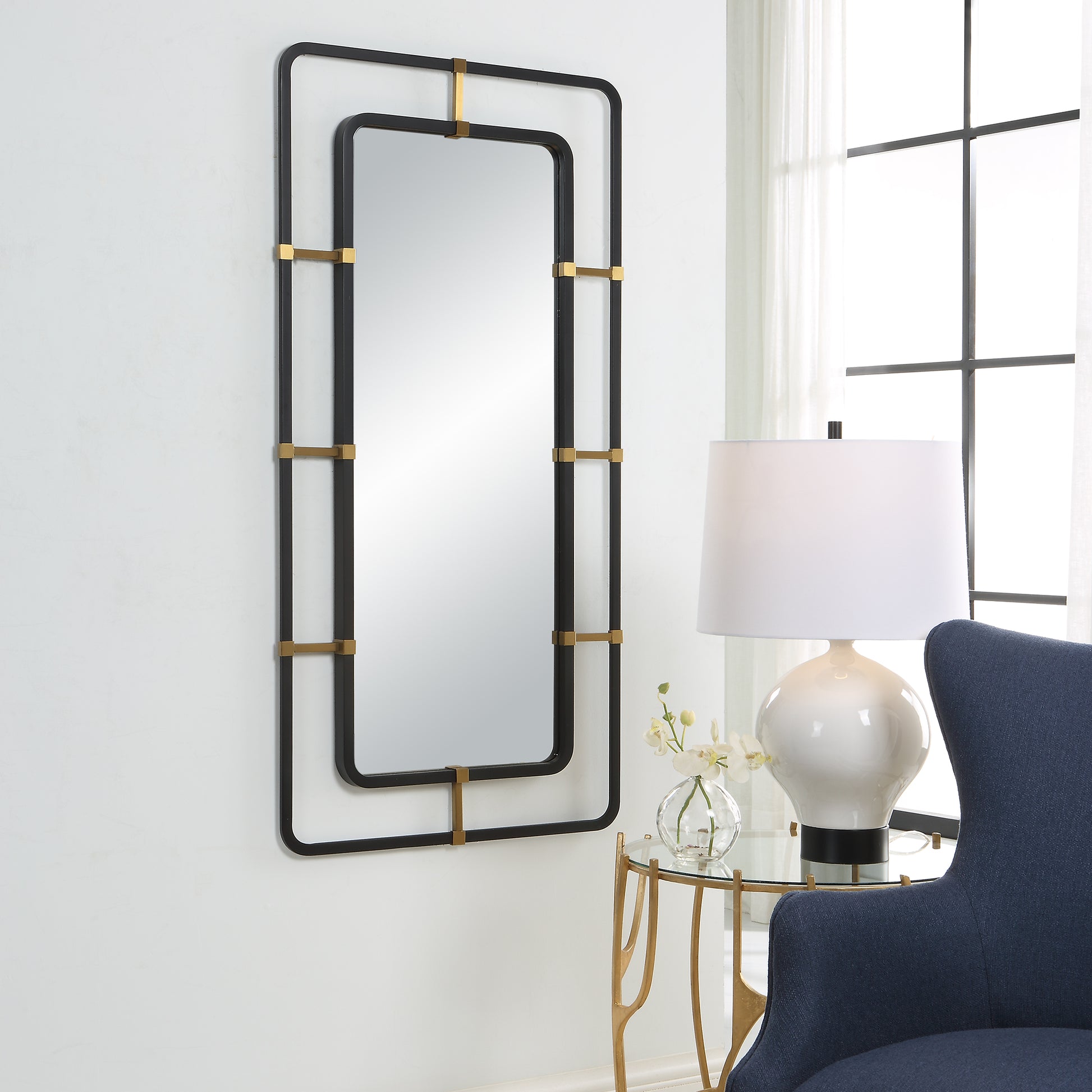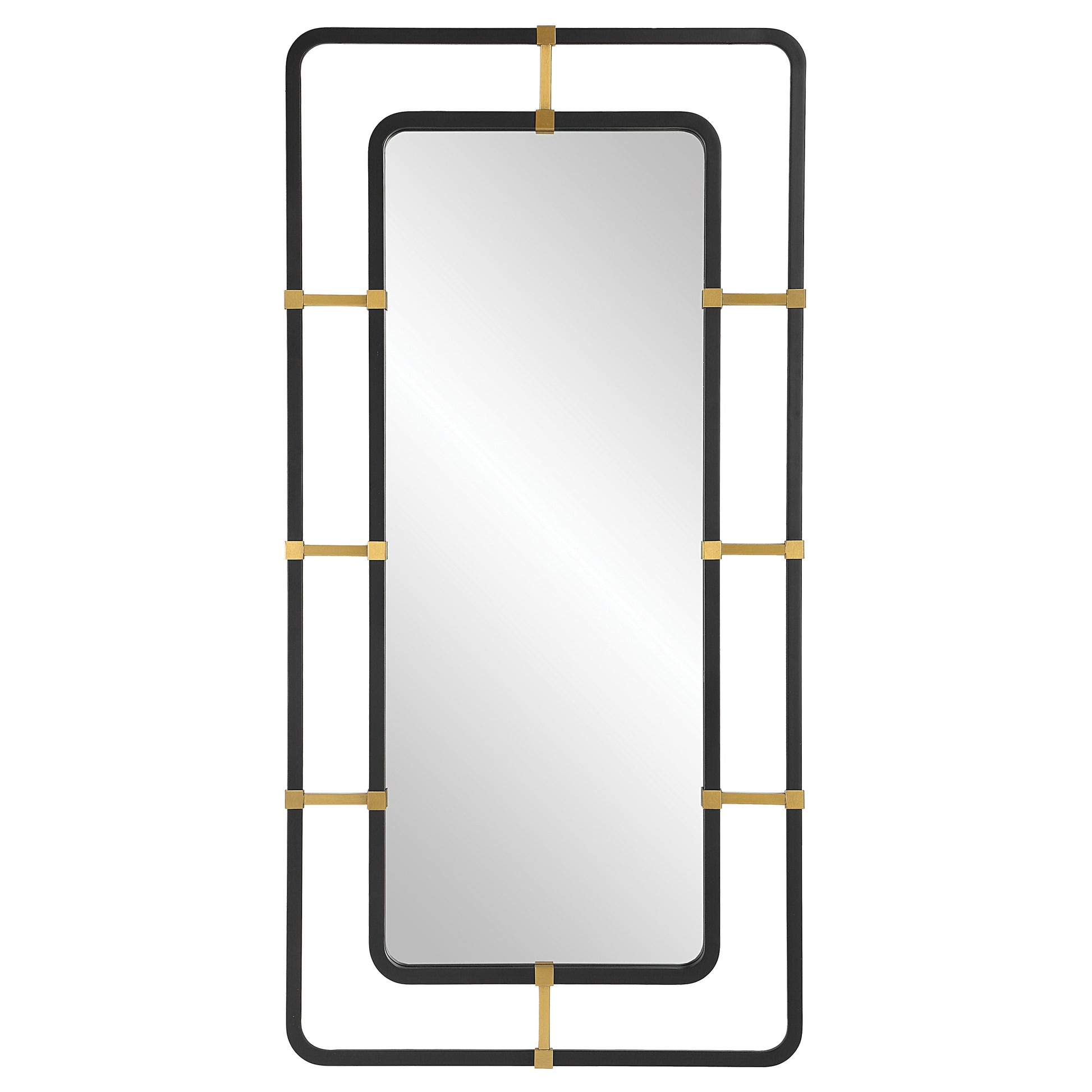 This contemporary style mirror is crafted with a stainless steel frame finished in a matte black accented by industrial inspired clips in plated brushed brass. May be hung horizontal or vertical. Dimensions - 1.25in Depth x 26in Width x 52in Height. Weight - 27.5lbs