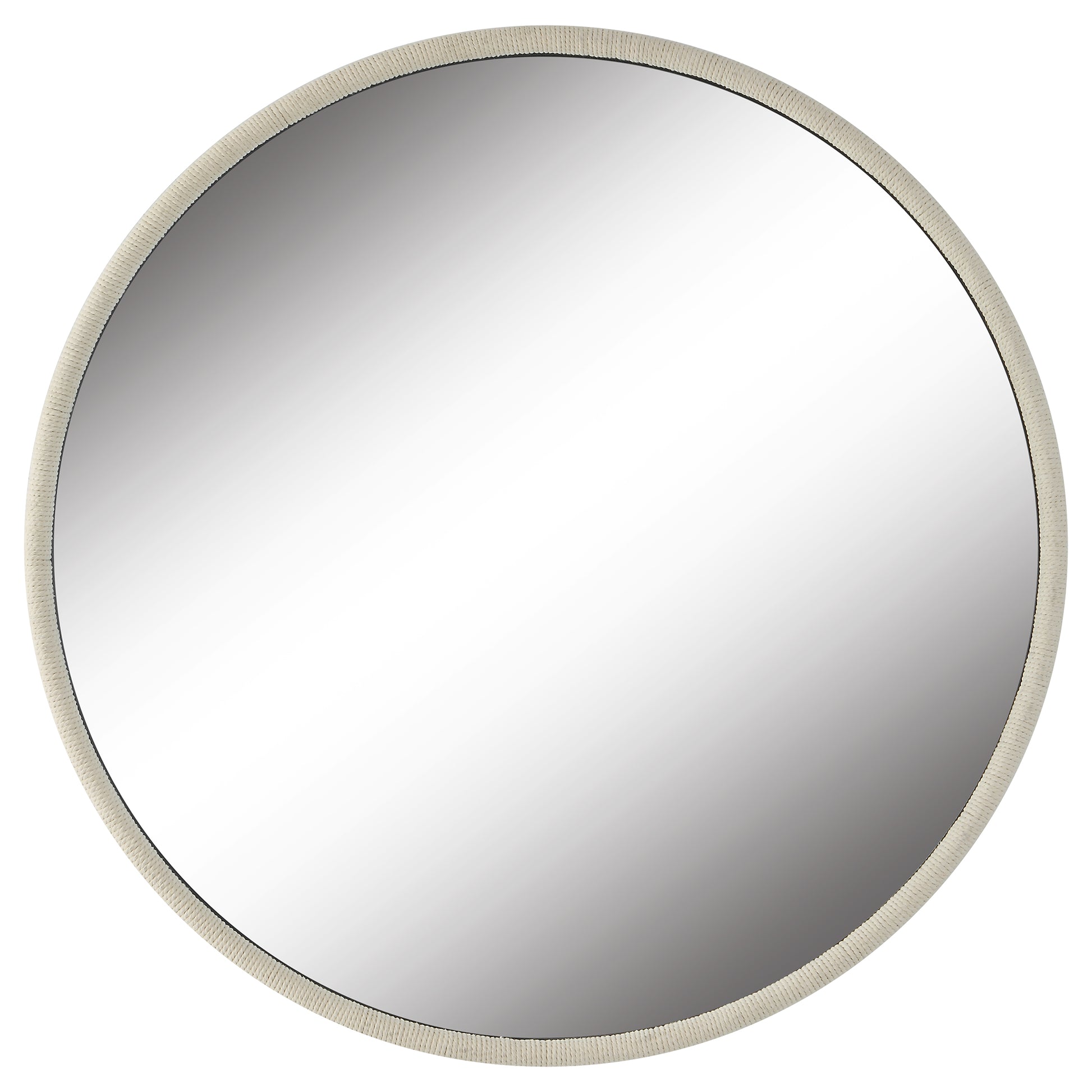 The ranchero round mirror adds an updated coastal flair with a black iron frame featuring a rounded profile wrapped in white braided rope. Mirror has a 1 1/4" bevel. Dimensions - 2.125in Depth x 42.5in Width x 42.5in Height. Weight - 28lbs