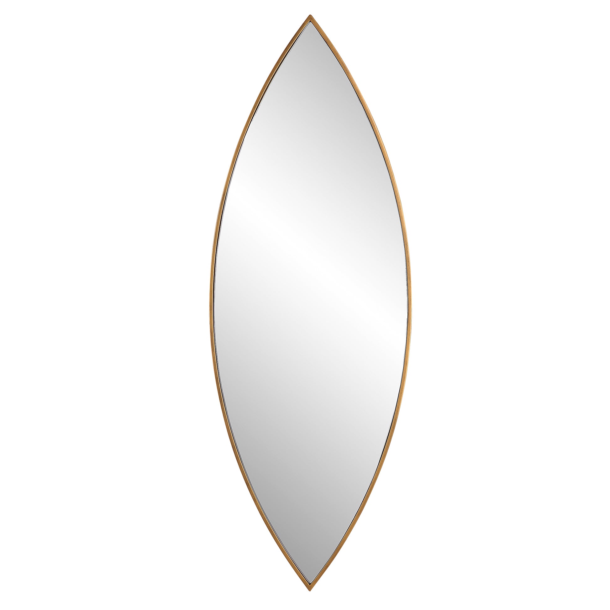 The ellipse mirror features a petite iron frame surrounding a floating polished edged mirror with a deep edge that shows off the antiqued golden bronze finish. Dimensions - 2.375in Depth x 14.125in Width x 40in Height. Weight - 12.5lbs