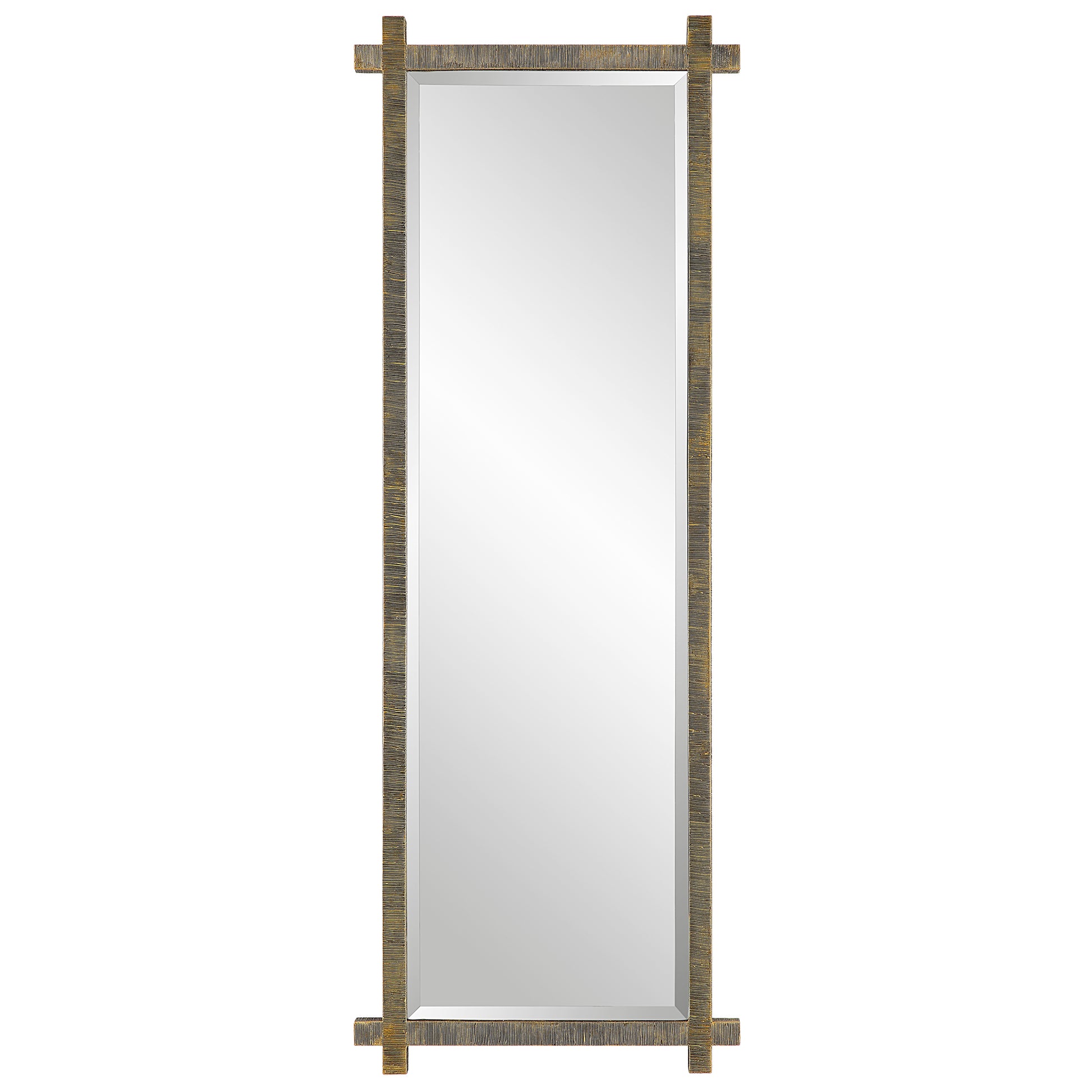 This dressing mirror features a heavily antique gold finished frame with ribbed texture, adding a tribal feel. The piece has a generous 1 1/4" bevel and may be hung horizontal or vertical. Dimensions - 1.25in Depth x 22in Width x 60.25in Height. Weight - 36.5lbs