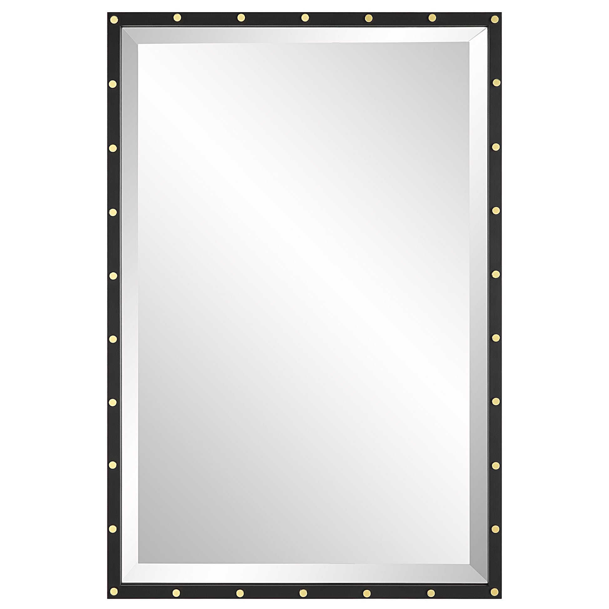 This urban industrial design features an iron frame finished in matte black adorned with plated brass smooth screw caps. Mirror has a generous 1 1/4" bevel. May be hung horizontal or vertical. Dimensions - 1.125in Depth x 24in Width x 35.875in Height. Weight - 20lbs