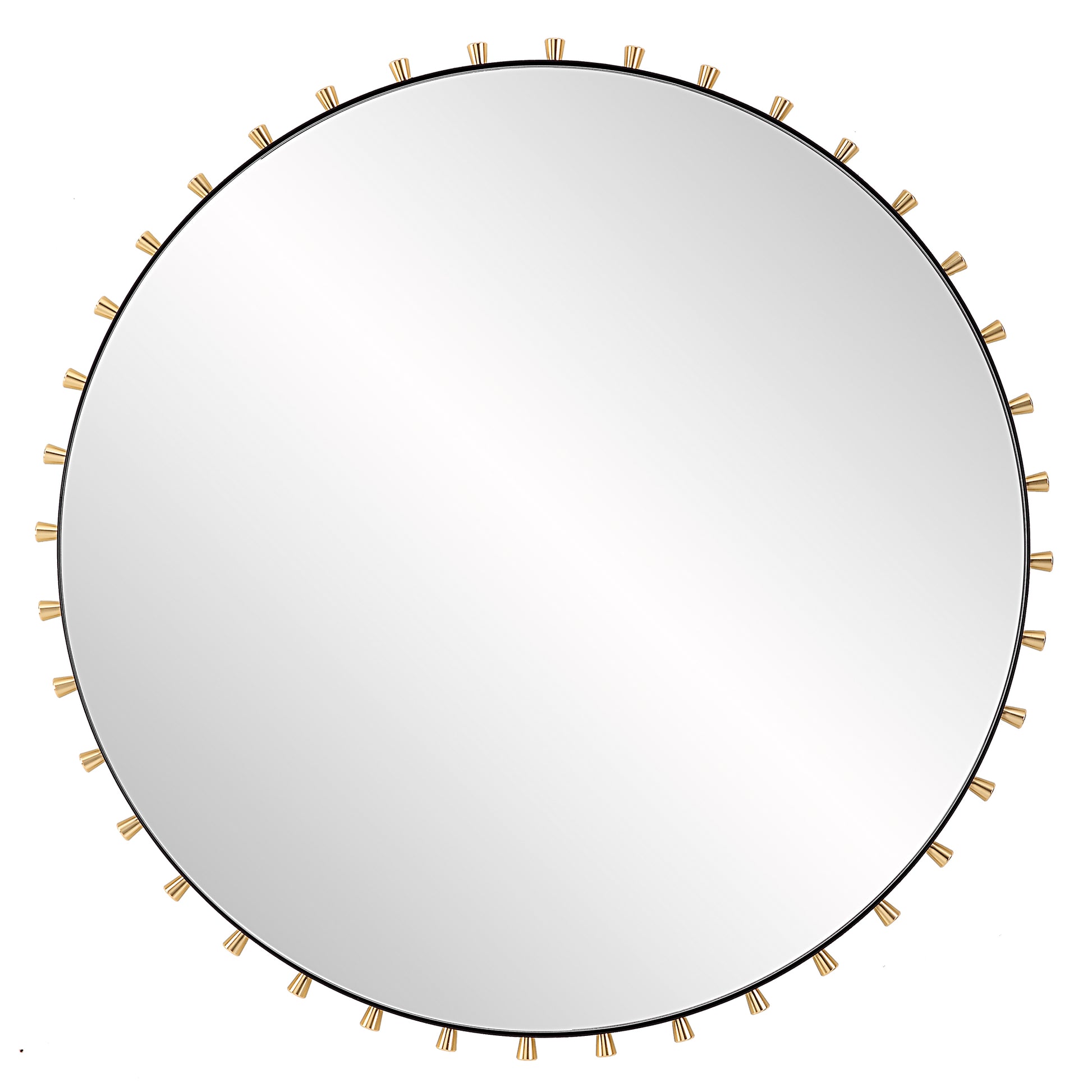 This modern round mirror features a iron frame finished in matte black, adorned with brass plated tapered round pegs surrounding a floating polished edged mirror. Dimensions - 1.75in Depth x 37.375in Width x 37.375in Height. Weight - 27lbs