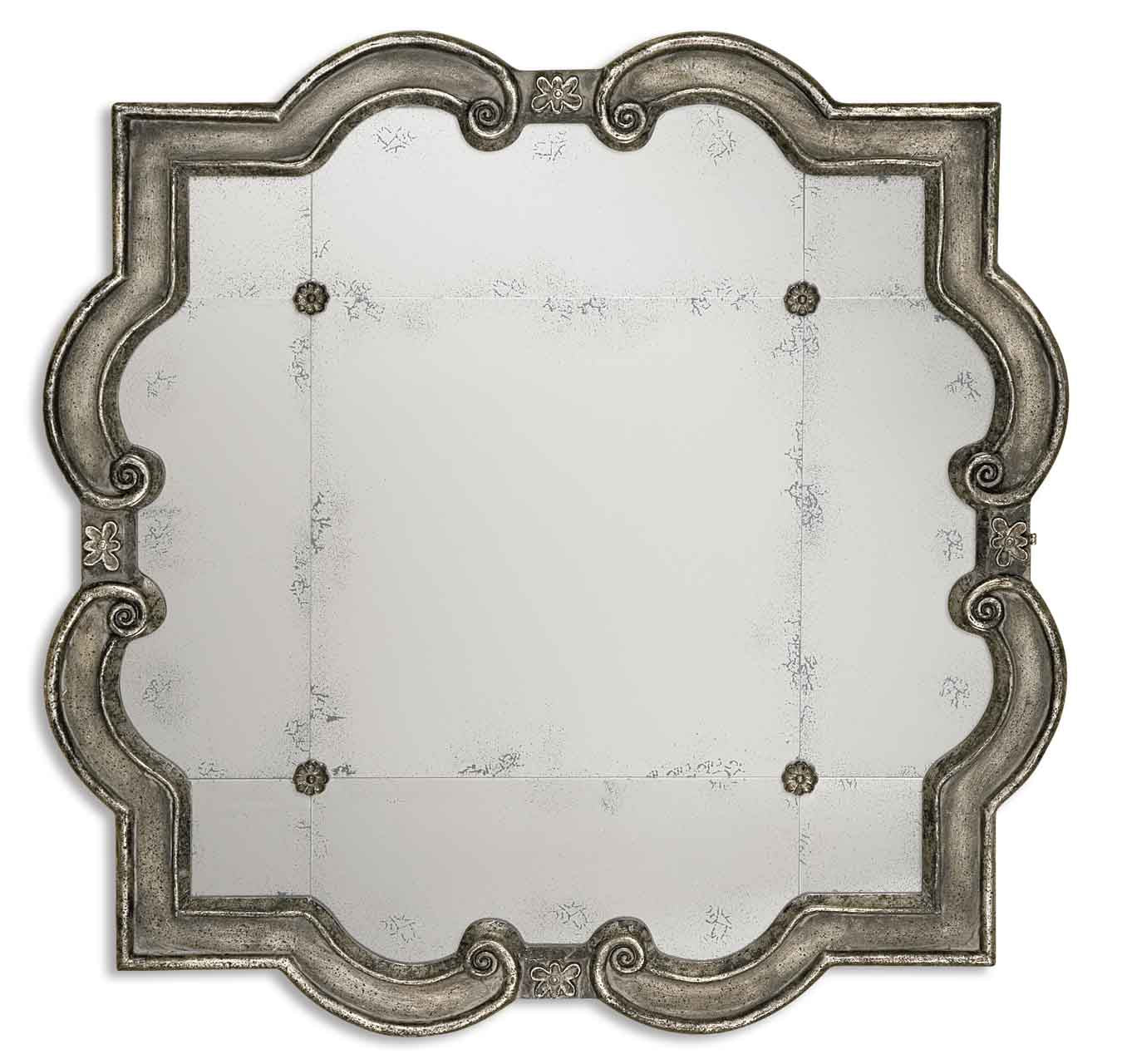 This antique mirror is accented by four rosettes. The wood frame has a distressed silver leaf finish with black undertones. Dimensions - 2in Depth x 36in Width x 36in Height. Weight - 30lbs