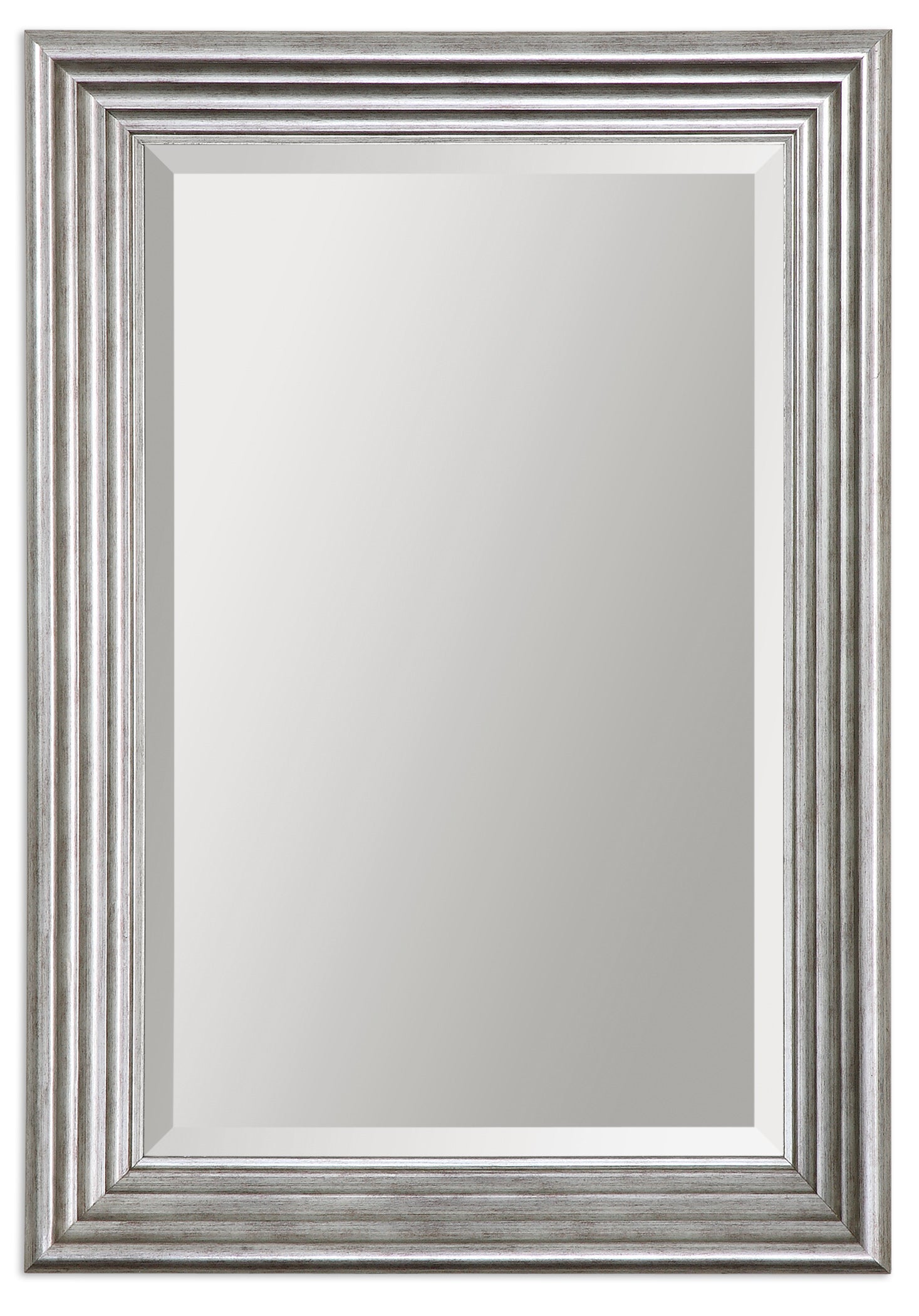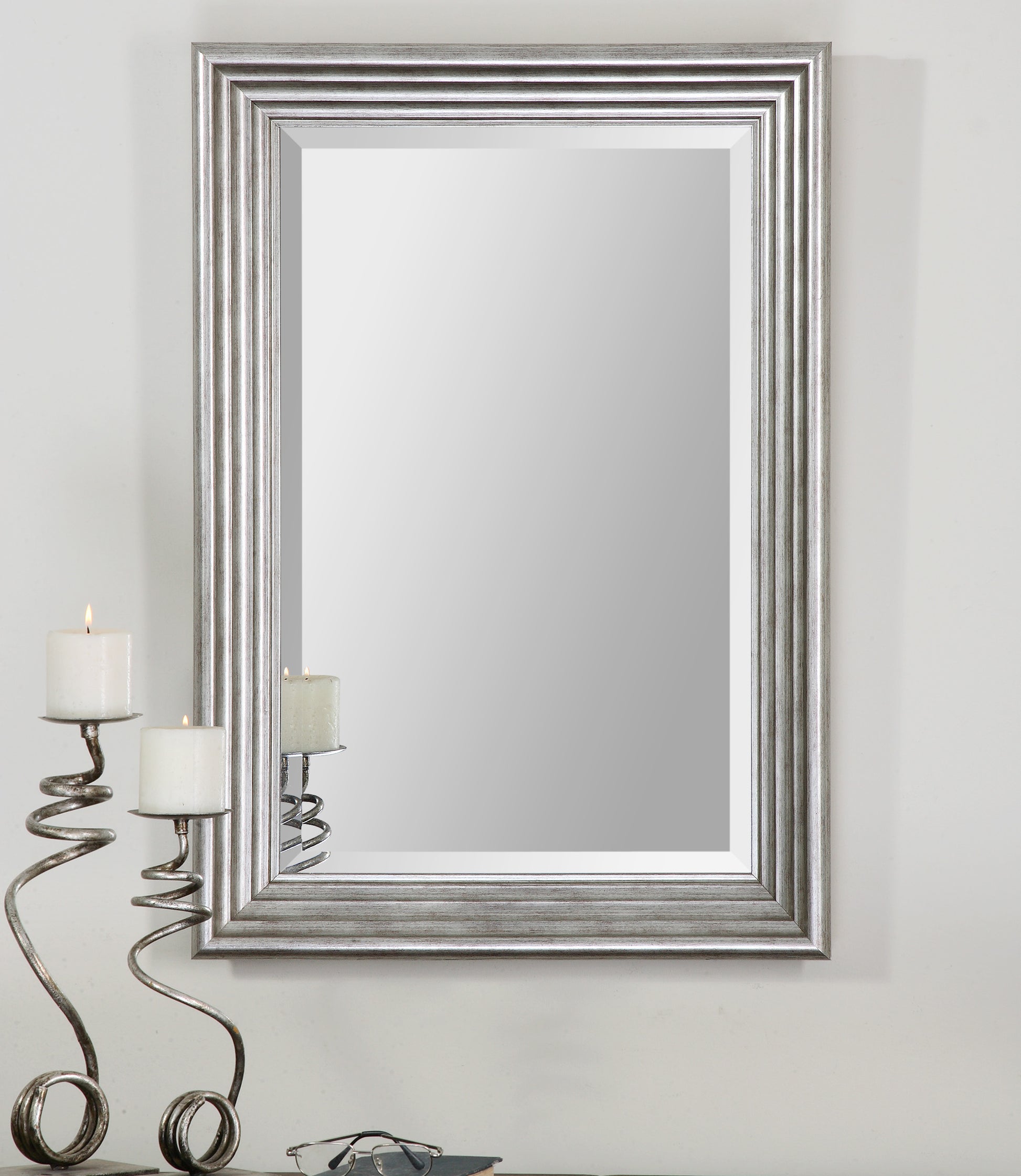Frame has a lightly distressed silver finish with dark red undertones. Mirror is beveled. May be hung horizontal or vertical. Set of 2 Dimensions - 2.625in Depth x 23.5in Width x 33.5in Height. Weight - 14.38lbs