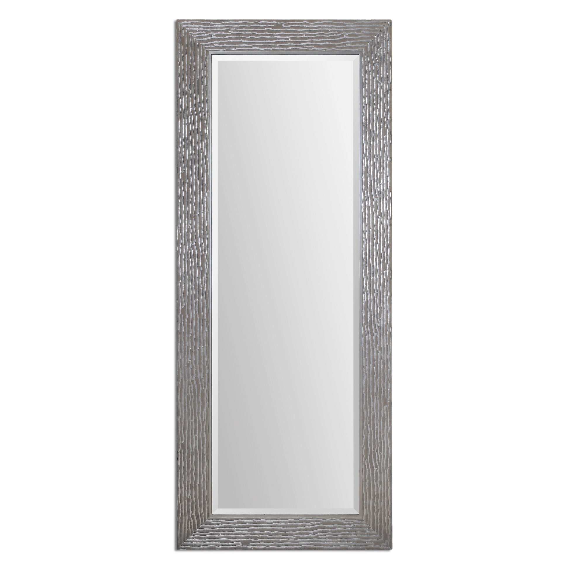 Frame has a metallic silver finish with a heavy, taupe-gray wash. Mirror has a generous 1 1/4" bevel and may be hung horizontal or vertical. Dimensions - 1.5in Depth x 33.5in Width x 81.5in Height. Weight - 62lbs