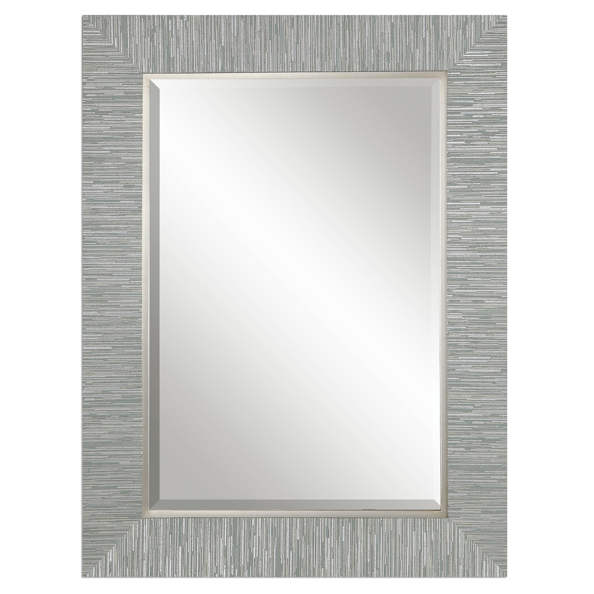 Solid wood frame with a blue-gray and silver striped, textured wrap finish accented with a silver leaf inner lip. Mirror is beveled and may be hung horizontal or vertical. Dimensions - 1.25in Depth x 28in Width x 38in Height. Weight - 18lbs