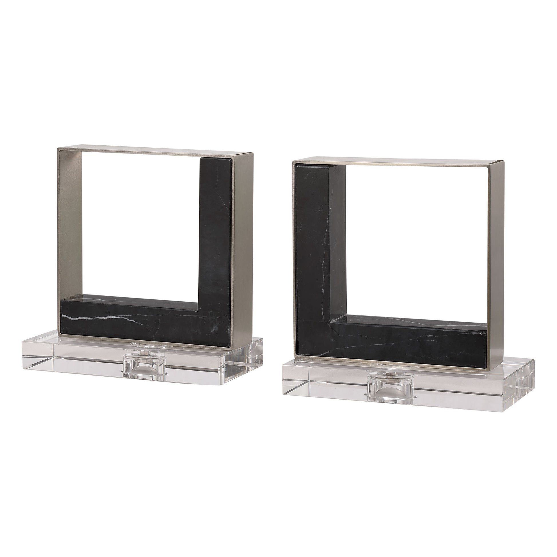 Modern and sophisticated, these bookends feature black marble accents with white veining, accented by brushed nickel finished steel and crystal accents. Dimensions - 4in Depth x 7.5in Width x 8in Height. Weight - 13.4lbs