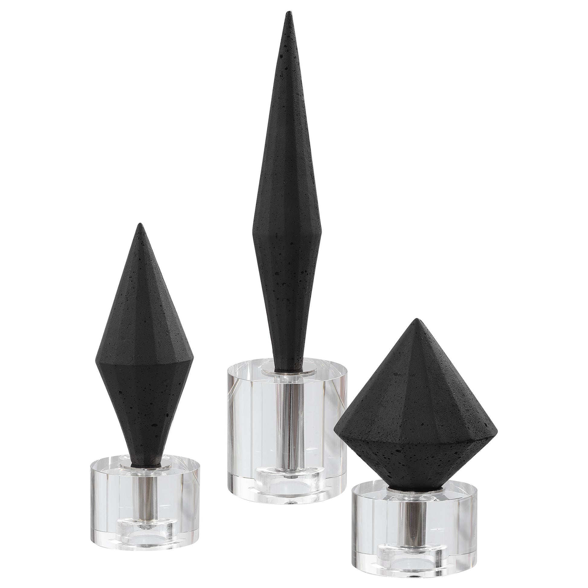 Elegant black diamonds crafted from black man-made stone atop crystal bases. Sizes: s-5x7x5, m-4x10x4, l-4x14x4 Dimensions - 3.5in Depth x 3.5in Width x 14in Height. Weight - 11lbs