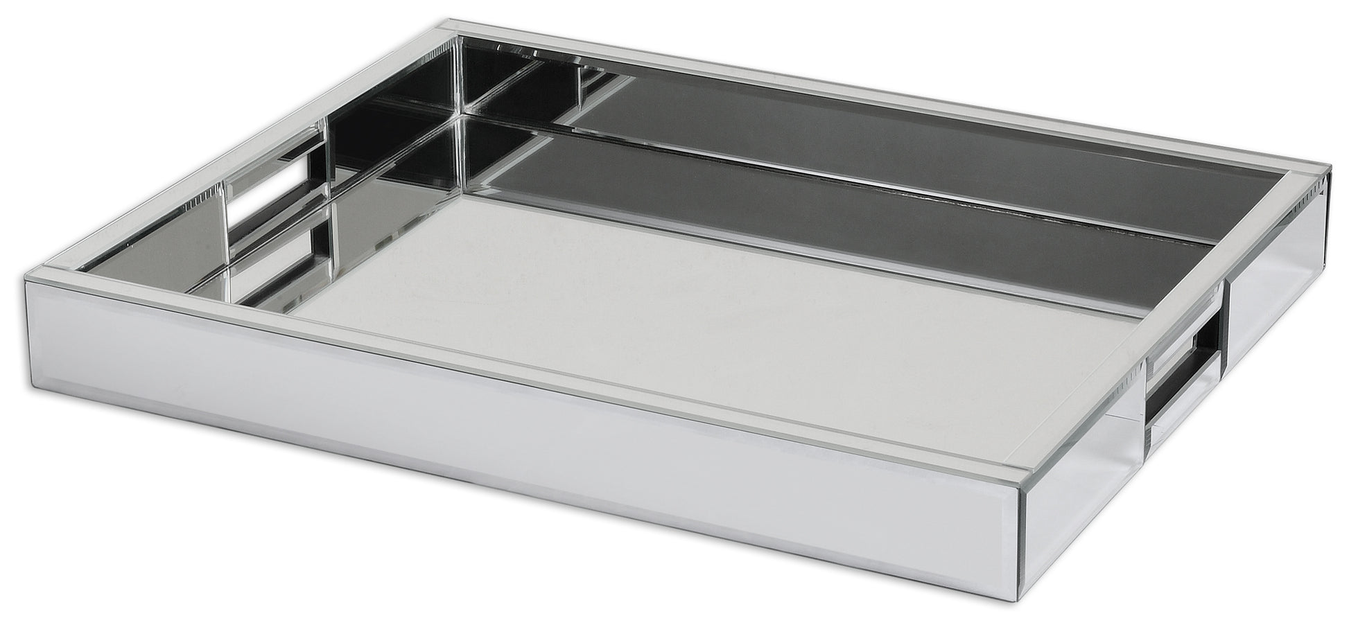 Decorative and functional tray constructed of multiple mirrors with polished edges for a smooth finish. Dimensions - 14in Depth x 18in Width x 2.25in Height. Weight - 7lbs