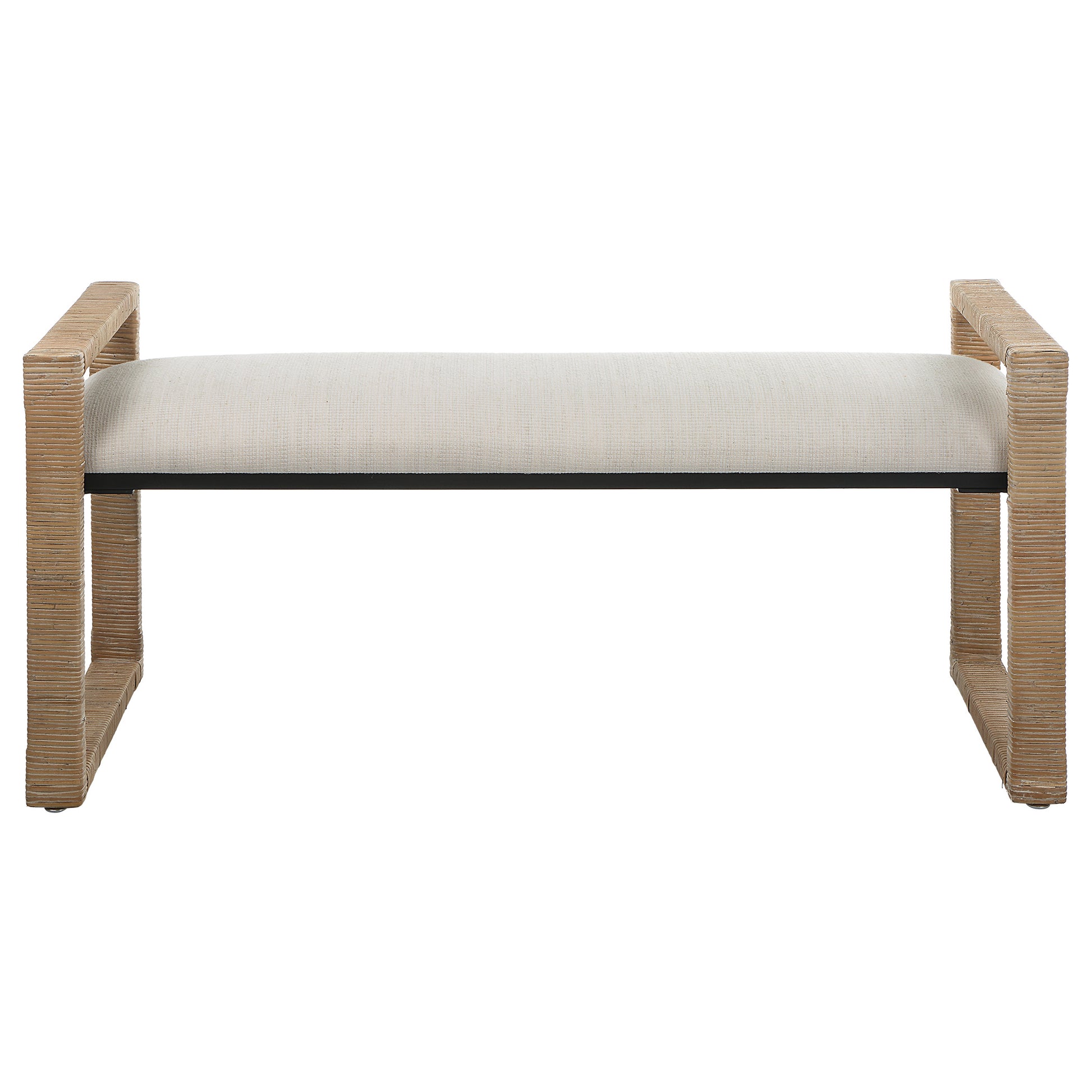 Inspired by the casual style of coastal designs, the areca bench showcases a natural rattan wrapped iron frame accented by a textured oatmeal toned waffle weave performance fabric. Dimensions - 17.5in Depth x 48in Width x 21.25in Height. Weight - 28lbs