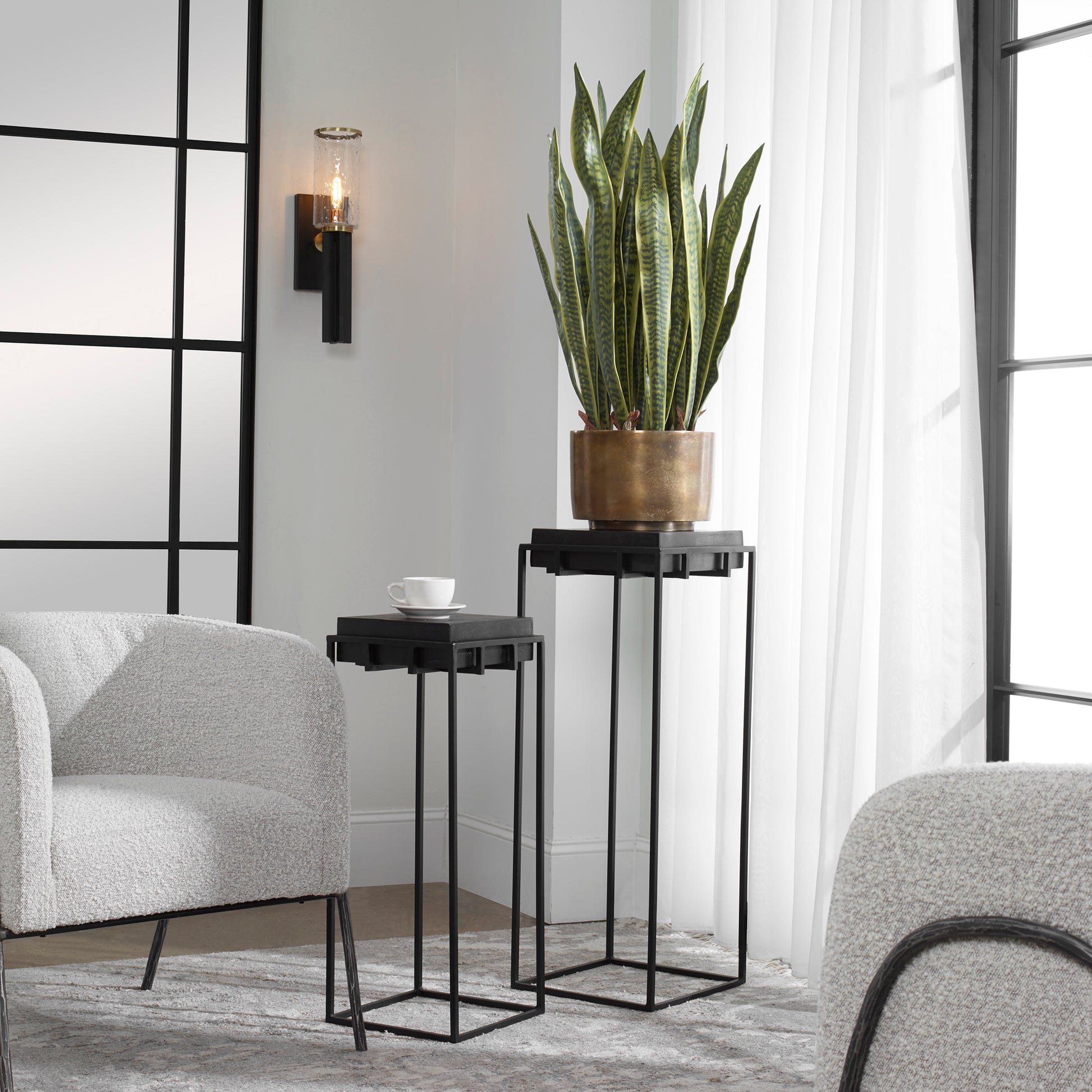 With modern minimalist styling, this pedestal table features a thick cast aluminum top with natural texturing finished in a plated antique black, resting in a coordinating aged black iron base. Perfect for displaying a sculpture or for use as a plant stand. Dimensions - 13in Depth x 13in Width x 36in Height. Weight - 17lbs