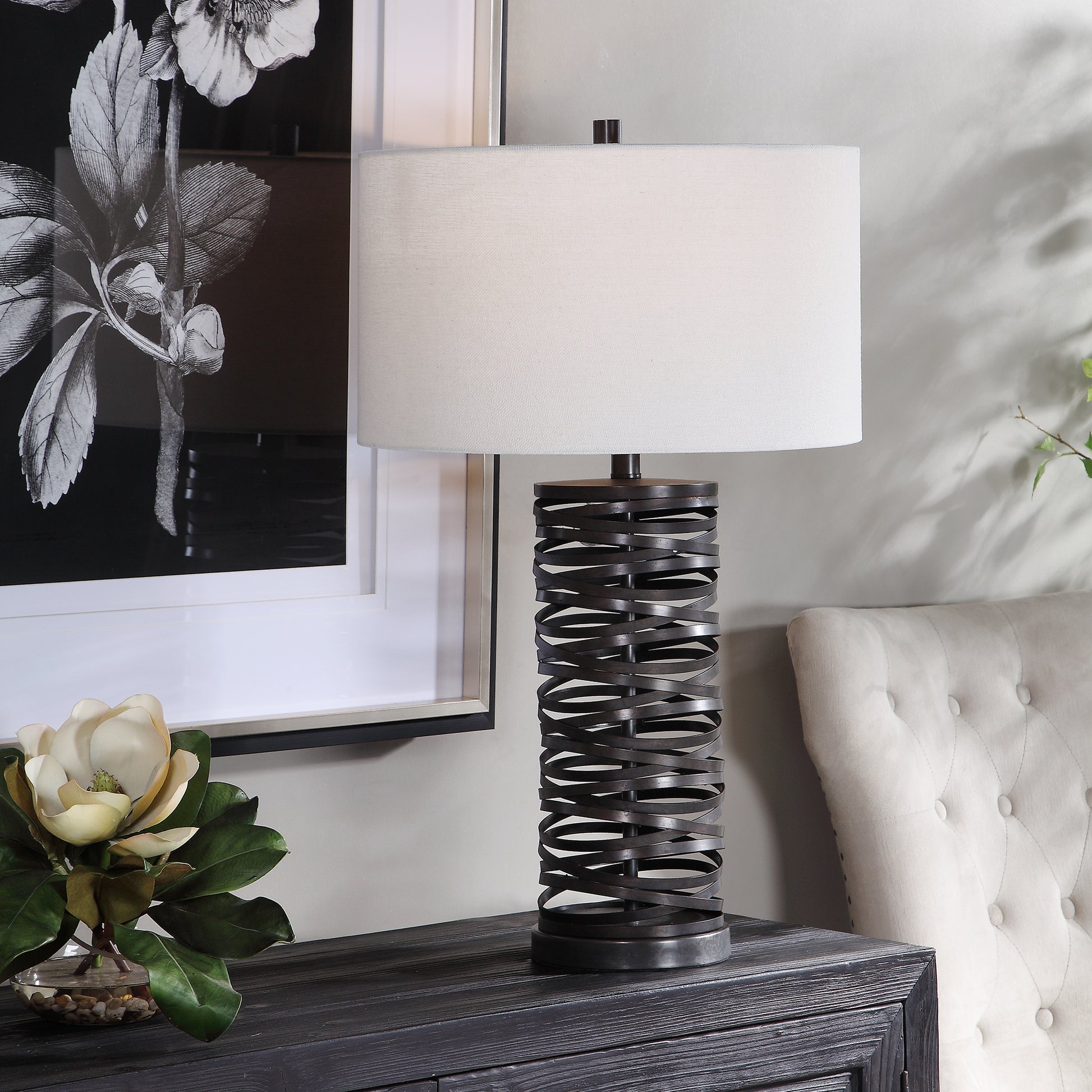 Add a touch of industrial flair with this table lamp that features overlapping straps of metal finished in a aged rust black. The round hardback shade is a white linen fabric. Dimensions - 17in Depth x 17in Width x 29.25in Height. Weight - 9.9lbs