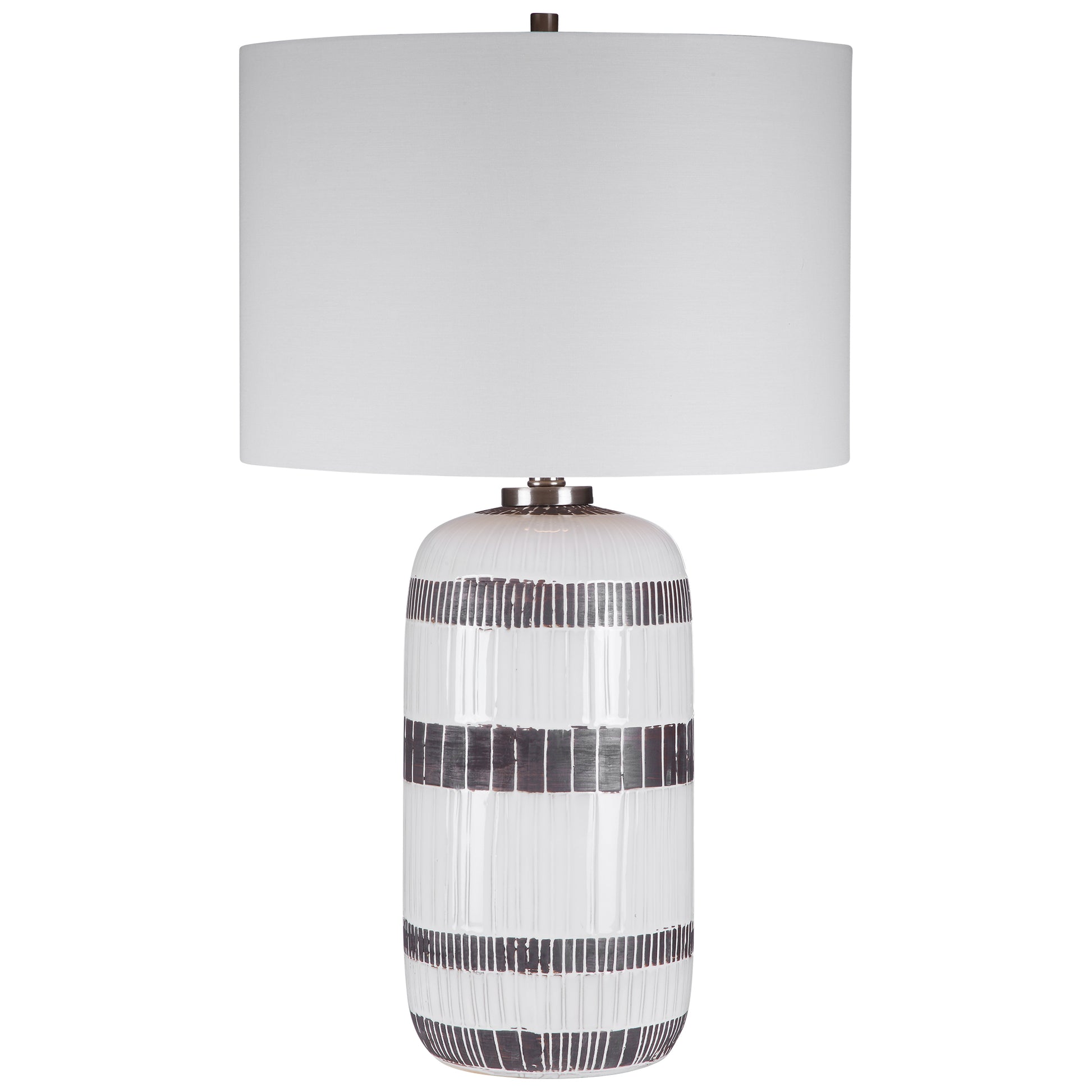 Add a touch of lodge style to your space with this ceramic table lamp. The base features vertical embossed texture finished in an aged white glaze with dark, chocolate brown details, accented with brushed nickel details. The hardback drum shade is a white linen fabric. Dimensions - 17in Depth x 17in Width x 28.75in Height. Weight - 9.6lbs