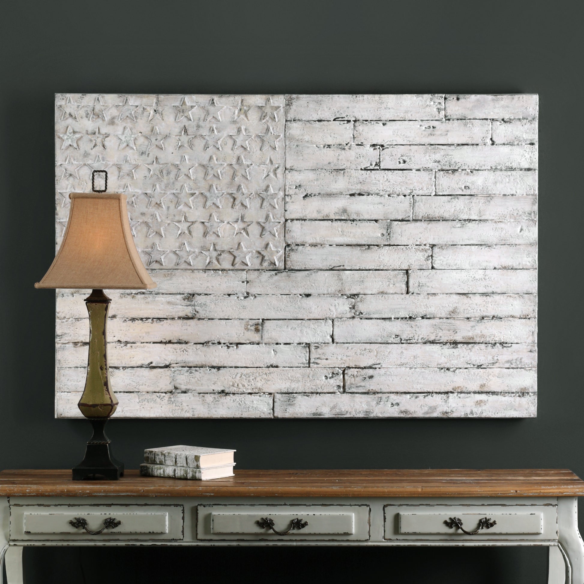 This hand painted, patriotic artwork is created from sculpted foam board, giving it a 3-dimensional effect. Finished in a distressed white, the foam is attached to stretched canvas and applied to wooden stretchers. Due to the handcrafted nature of this artwork, each piece may have subtle differences. Dimensions - 1.5in Depth x 60in Width x 40in Height. Weight - 14lbs